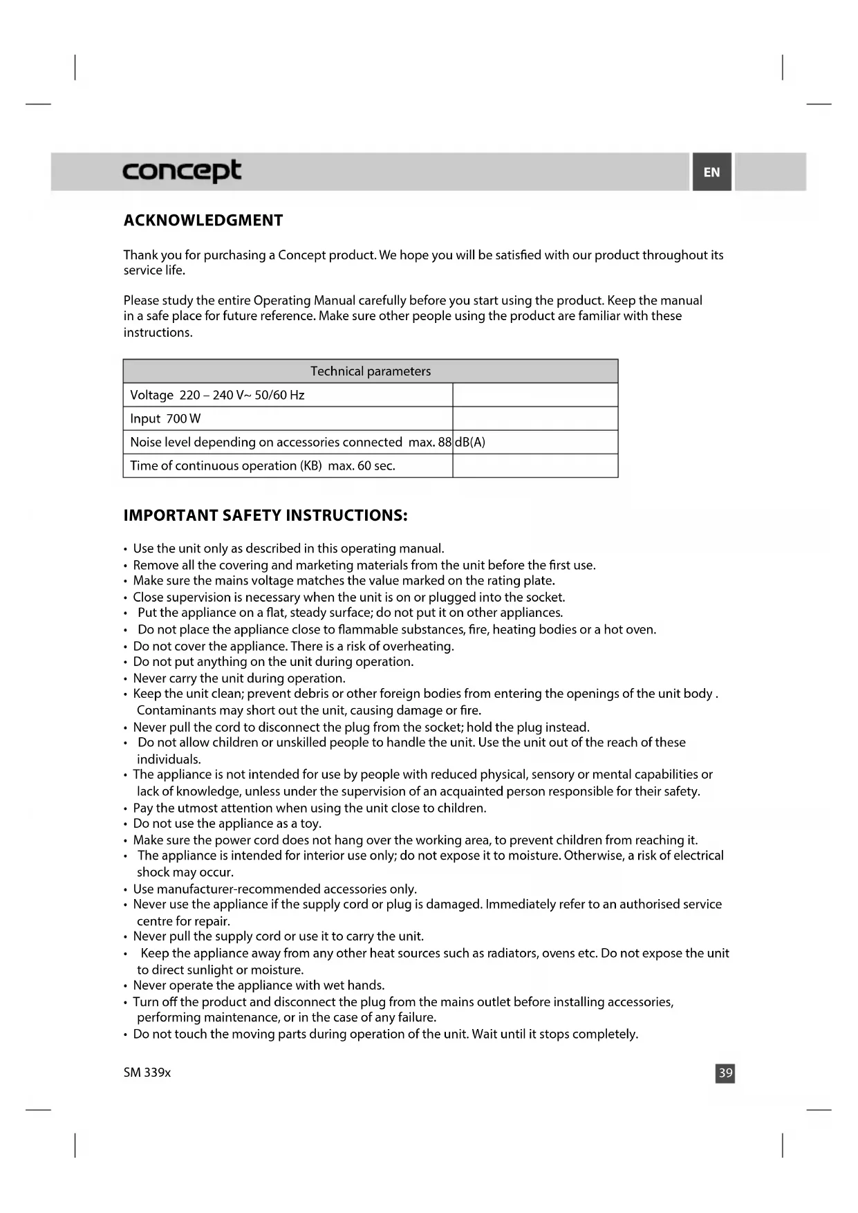 ACKNOWLEDGMENT Thank you for purchasing a Concept product. We hope you will be satised with our product throughout its service life. Please study the entire Operating Manual carefully before you start using the product. Keep the manual in a safe place for future reference. Make sure other people using the product are familiar with these instructions. Technical parameters Voltage 220 – 240 V~ 50/60 Hz Input 700 W Noise level depending on accessories connected max. 88 dB(A) Time of continuous operation (KB) max. 60 sec. IMPORTANT SAFETY INSTRUCTIONS: