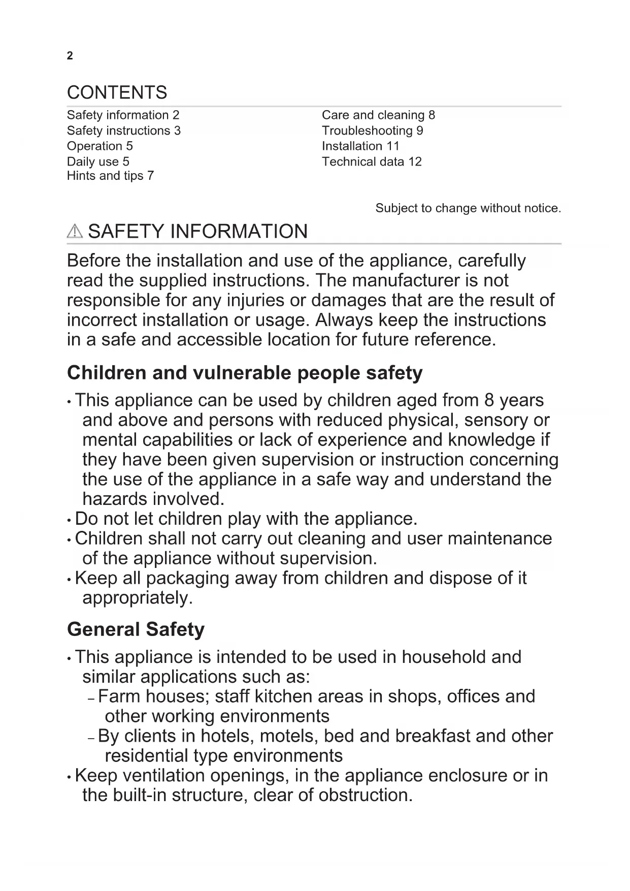 AMN3210AOW EN Refrigerator User Manual 2 FR Réfrigérateur Notice d'utilisation 14 DE Kühlschrank Benutzerinformation 27CONTENTS Safety information 2 Safety instructions 3 Operation 5 Daily use 5 Hints and tips 7 Care and cleaning 8 Troubleshooting 9 Installation 11 Technical data 12 Subject to change without notice. SAFETY INFORMATION Before the installation and use of the appliance, carefully read the supplied instructions. The manufacturer is not responsible for any injuries or damages that are the result of incorrect installation or usage. Always keep the instructions in a safe and accessible location for future reference. Children and vulnerable people safety