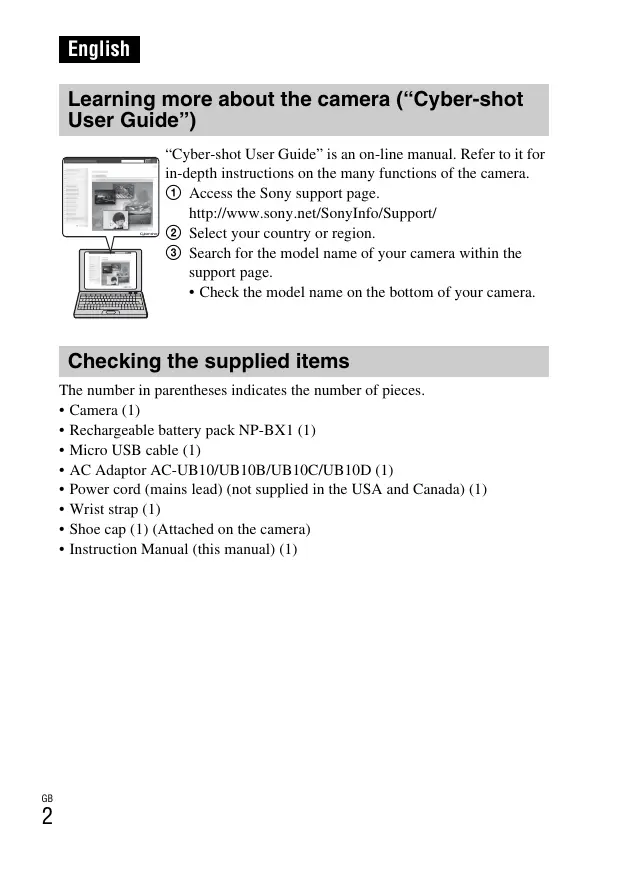English Learning more about the camera (“Cyber-shot User Guide”) “Cyber-shot User Guide” is an on-line manual. Refer to it for in-depth instructions on the many functions of the camera. 1 Access the Sony support page. http://www.sony.net/SonyInfo/Support/ 2 Select your country or region. 3 Search for the model name of your camera within the support page.