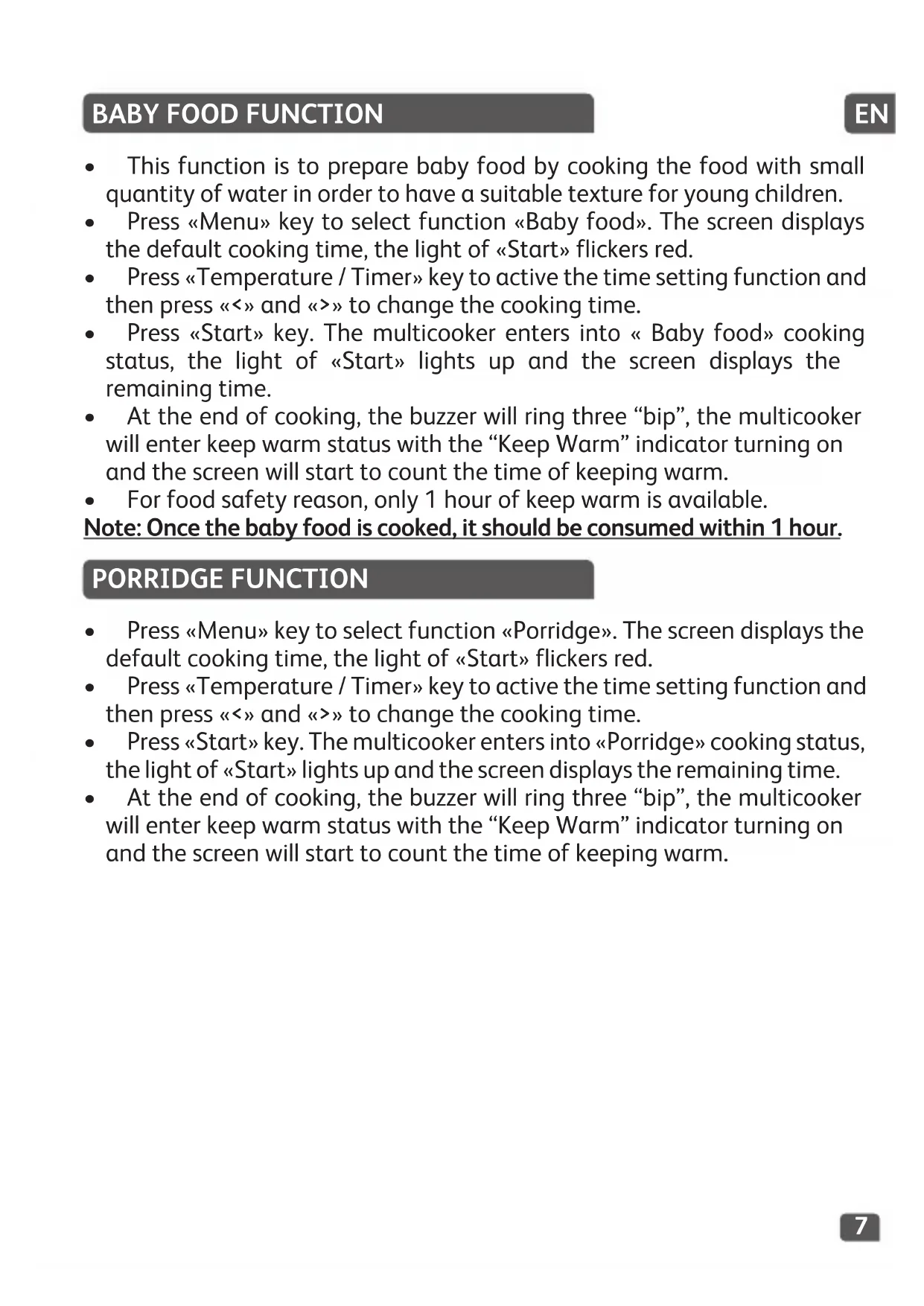 - For food safety reason, only 1 hour of keep warm is available. Note: Once the baby food is cooked, it should be consumed within 1 hour. PORRIDGE FUNCTION