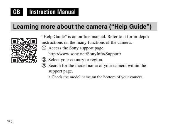 Instruction Manual Learning more about the camera (“Help Guide”) “Help Guide” is an on-line manual. Refer to it for in-depth instructions on the many functions of the camera. 1 Access the Sony support page. http://www.sony.net/SonyInfo/Support/ 2 Select your country or region. 3 Search for the model name of your camera within the support page.