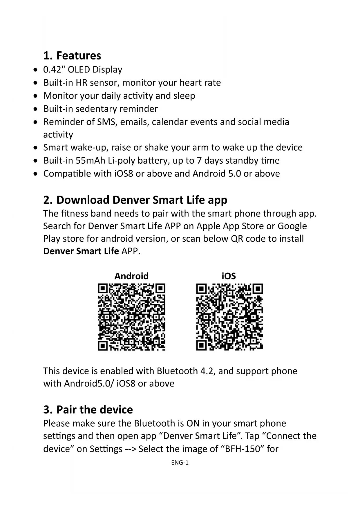Please make sure the Bluetooth is ON in your smart phone settings and then open app “Denver Smart Life”. Tap “Connect the device” on Settings --> Select the image of “BFH-150” forENG-2 connection. When searching and pairing device, please press on the touch area of device and activate the device (screen on). App will search the device automatically, select the device name in the smart phone searching list and connect the device to the app. After binding successfully, all information on device will sync on APP, including time, steps, heart rate and notifications reminder.