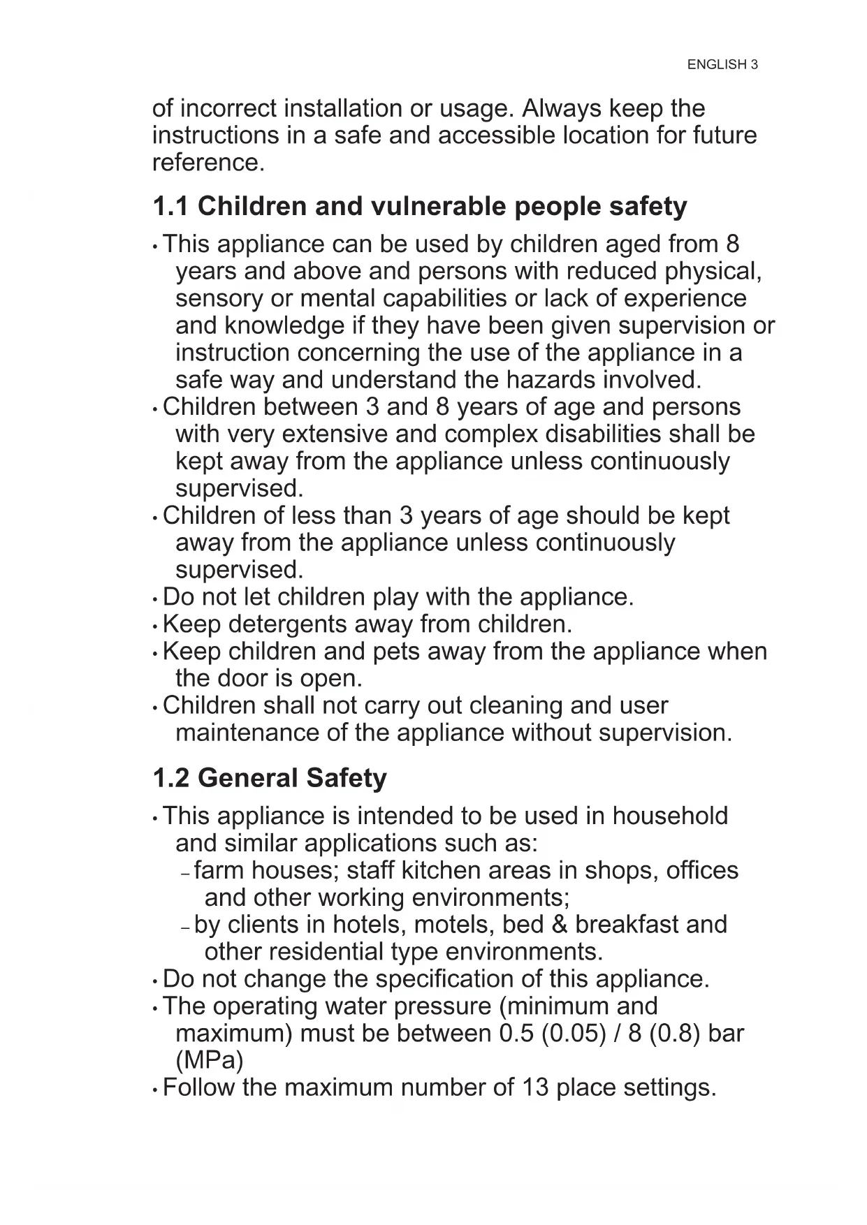 - Follow the maximum number of 13 place settings. ENGLISH 3• If the supply cord is damaged, it must be replaced by the manufacturer, its Authorised Service Centre or similarly qualified persons in order to avoid a hazard.