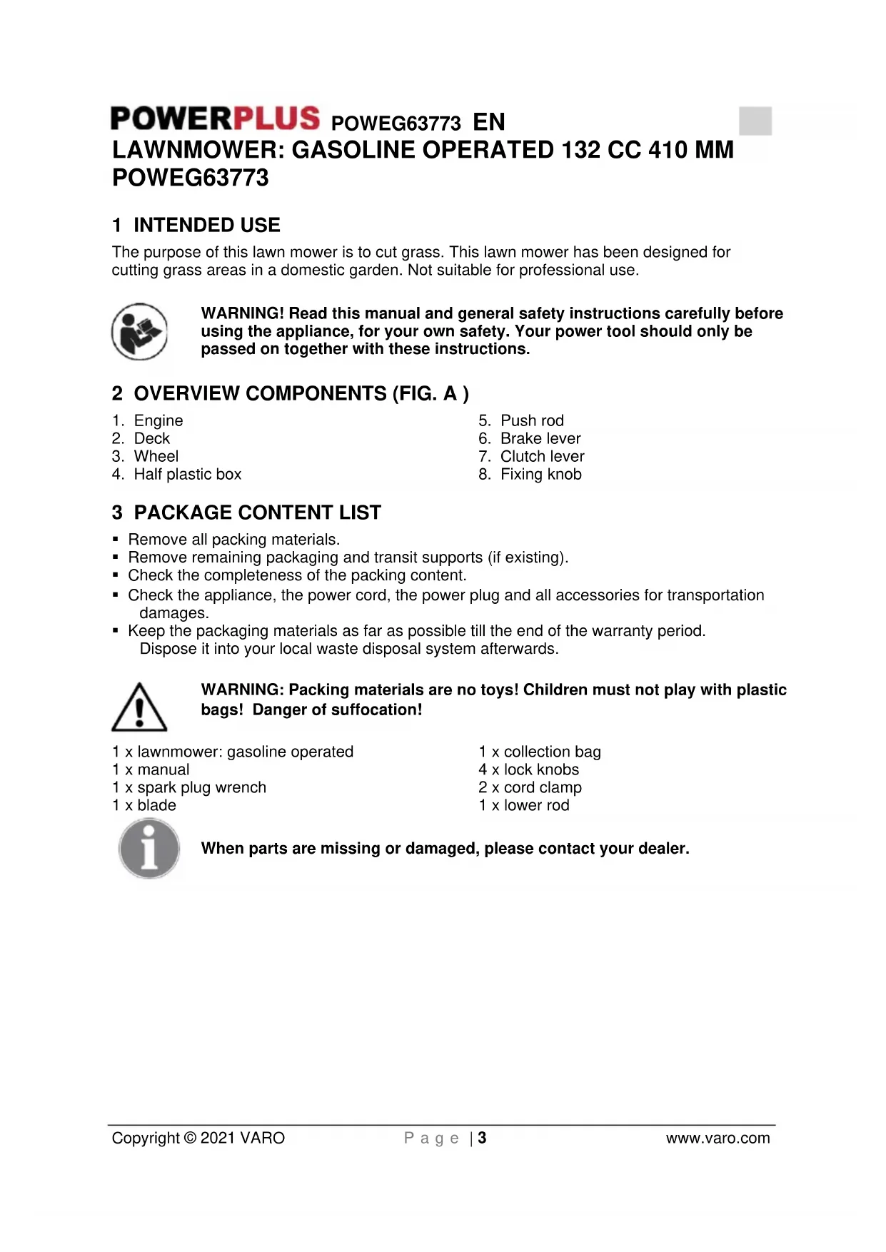 bags! Danger of suffocation! 1 x lawnmower: gasoline operated 1 x manual 1 x spark plug wrench 1 x blade 1 x collection bag 4 x lock knobs 2 x cord clamp 1 x lower rod When parts are missing or damaged, please contact your dealer.POWEG63773 EN Copyright © 2021 VARO P a g e | 4 www.varo.com 4 SYMBOLS In this manual and/or on the machine the following symbols are used: