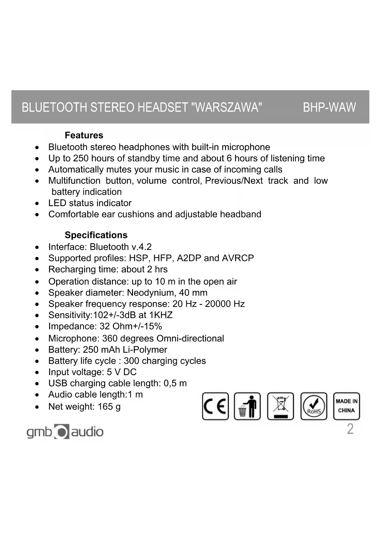 BHP-WAW Features Bluetooth stereo headphones with built-in microphone Up to 250 hours of standby time and about 6 hours of listening time Automatically mutes your music in case of incoming calls Multifunction button, volume control, Previous/Next track and low battery indication LED status indicator Comfortable ear cushions and adjustable headband Specifications Interface: Bluetooth v.4.2 Supported profiles: HSP, HFP, A2DP and AVRCP Recharging time: about 2 hrs Operation distance: up to 10 m in the open air Speaker diameter: Neodynium, 40 mm Speaker frequency response: 20 Hz - 20000 Hz Sensitivity:102+/-3dB at 1KHZ Impedance: 32 Ohm+/-15% Microphone: 360 degrees Omni-directional Battery: 250 mAh Li-Polymer Battery life cycle : 300 charging cycles Input voltage: 5 V DC USB charging cable length: 0,5 m Audio cable length:1 m Net weight: 165 g3