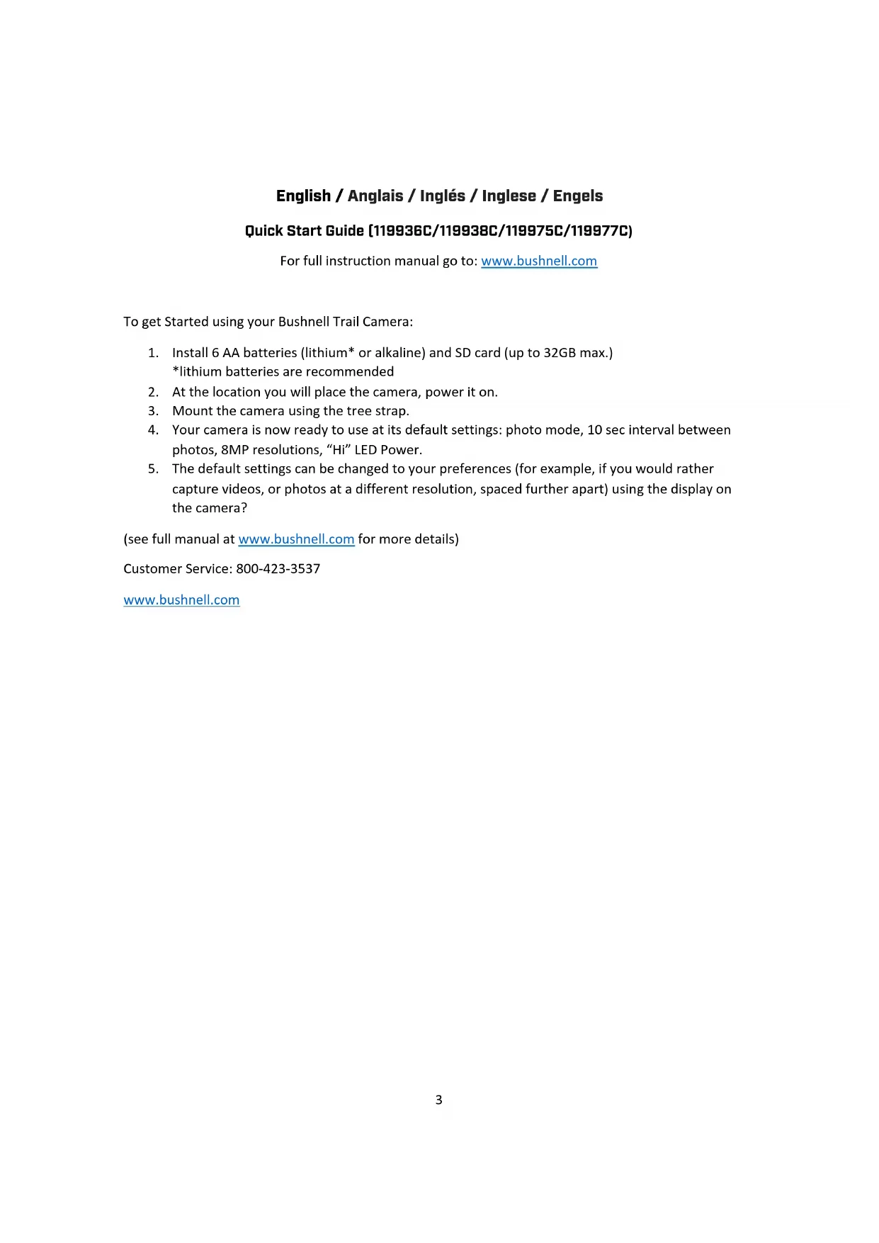capture videos, or photos at a different resolution, spaced further apart) using the display on the camera? (see full manual at www.bushnell.com for more details) Customer Service: 800-423-3537 www.bushnell.com4