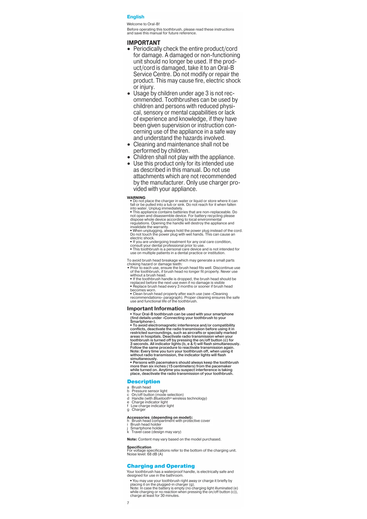 - The smartphone holder (j) (depending on model) can hold your smartphone while using. Before use, make sure your phone fits the stand and keeps stable. Note: Your smartphone must support Bluetooth 4.0 (or higher)/ Bluetooth Smart in order to pair your handle. Caution: Follow your smartphone’s user manual to ensure your phone/charger is designed for use in a bathroom environment. Cleaning recommendations After brushing, rinse your brush head under running water with the handle switched on. Switch off and remove the brush head. Clean handle and brush head separately; wipe them dry before reassembling. Unplug the charging unit before cleaning. Brush head compartment/protective cover (h), brush head holder (i) and smartphone holder (j) are dishwasher-safe. The charger (g) and travel case (k) should be cleaned with a damp cloth only (picture 7). Subject to change without notice. Environmental Notice Product contains batteries and/or recyclable electric waste. For environment protection do not dispose in household waste, but for recycling take to electric waste collection points provided in your country. Guarantee We grant 2 years guarantee on the product commencing on the date of purchase. Within the guarantee period we will eliminate, free of charge, any defects in the appliance resulting from faults in materials or workmanship, either by repairing or replacing the complete appliance as we may choose. This guarantee extends to every country where this appliance is supplied by Braun or its appointed distributor. This guarantee does not cover: damage due to improper use, normal wear or use, especially regarding the brush heads, as well as defects that have a negligible effect on the value or operation of the appliance. The guarantee becomes void if repairs are undertaken by unauthorised persons and if original Braun parts are not used. This appliance is equipped with a Bluetooth Smart approved radio module. Failure to establish a Bluetooth Smart connection to specific smart phones is not covered under the device guarantee, unless the Bluetooth radio module of this appliance is damaged. The Bluetooth devices are warranted by their own manufacturers and not by Oral-B. Oral-B does not influence or make any recommendations to device manufacturers, and therefore Oral-B does not assume any responsibility for the number of compatible devices with our Bluetooth systems. Oral-B reserves the right, without any prior notice, to make any technical modifications or changes to system implementation of device features, interface, and menu structure changes that are deemed necessary to ensure that Oral-B systems function reliably. To obtain service within the guarantee period, hand in or send the complete appliance with your sales receipt to an authorised Oral-B Braun Customer Service Centre. UK only: This guarantee in no way affects your rights under statutory law. Information Bluetooth