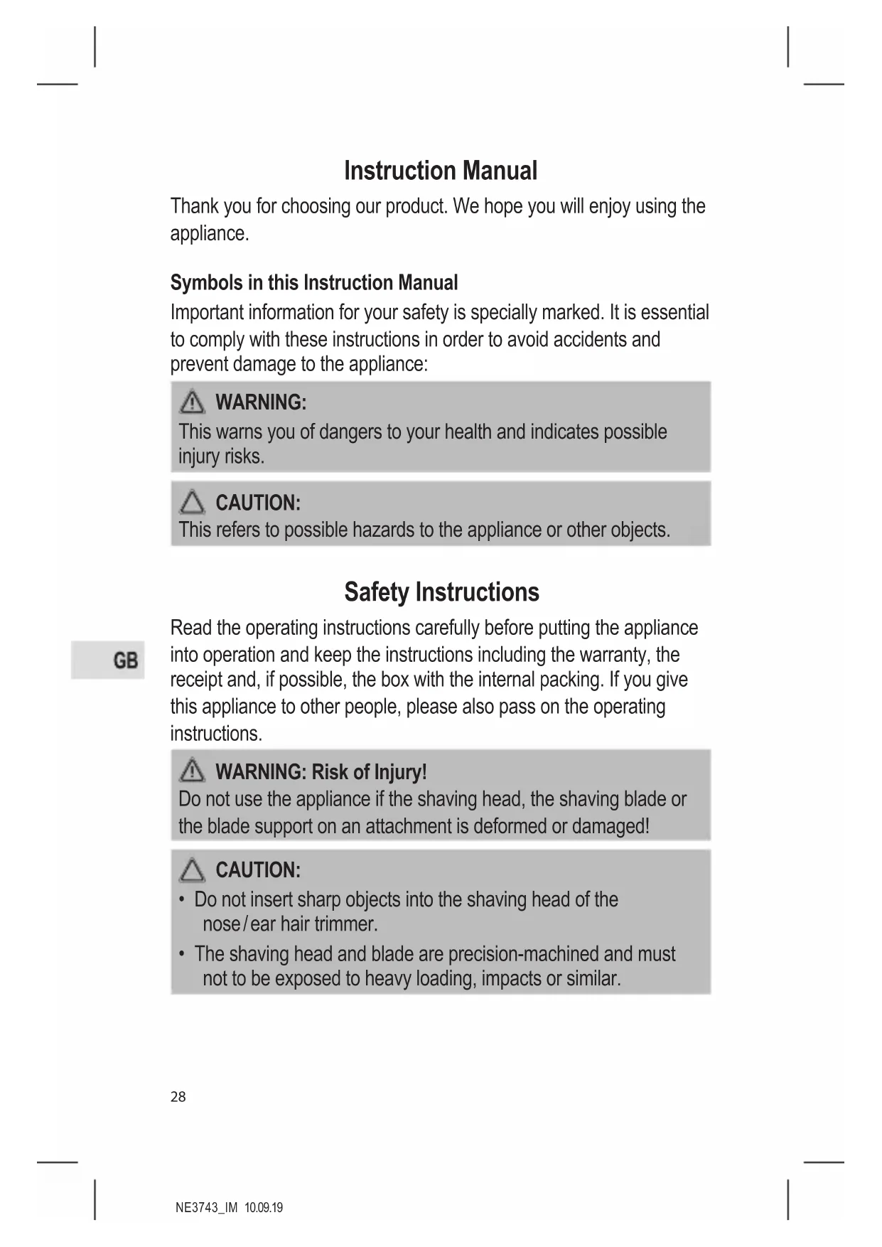 - The shaving head and blade are precision-machined and must not to be exposed to heavy loading, impacts or similar.29 NE3743_IM 10.09.19