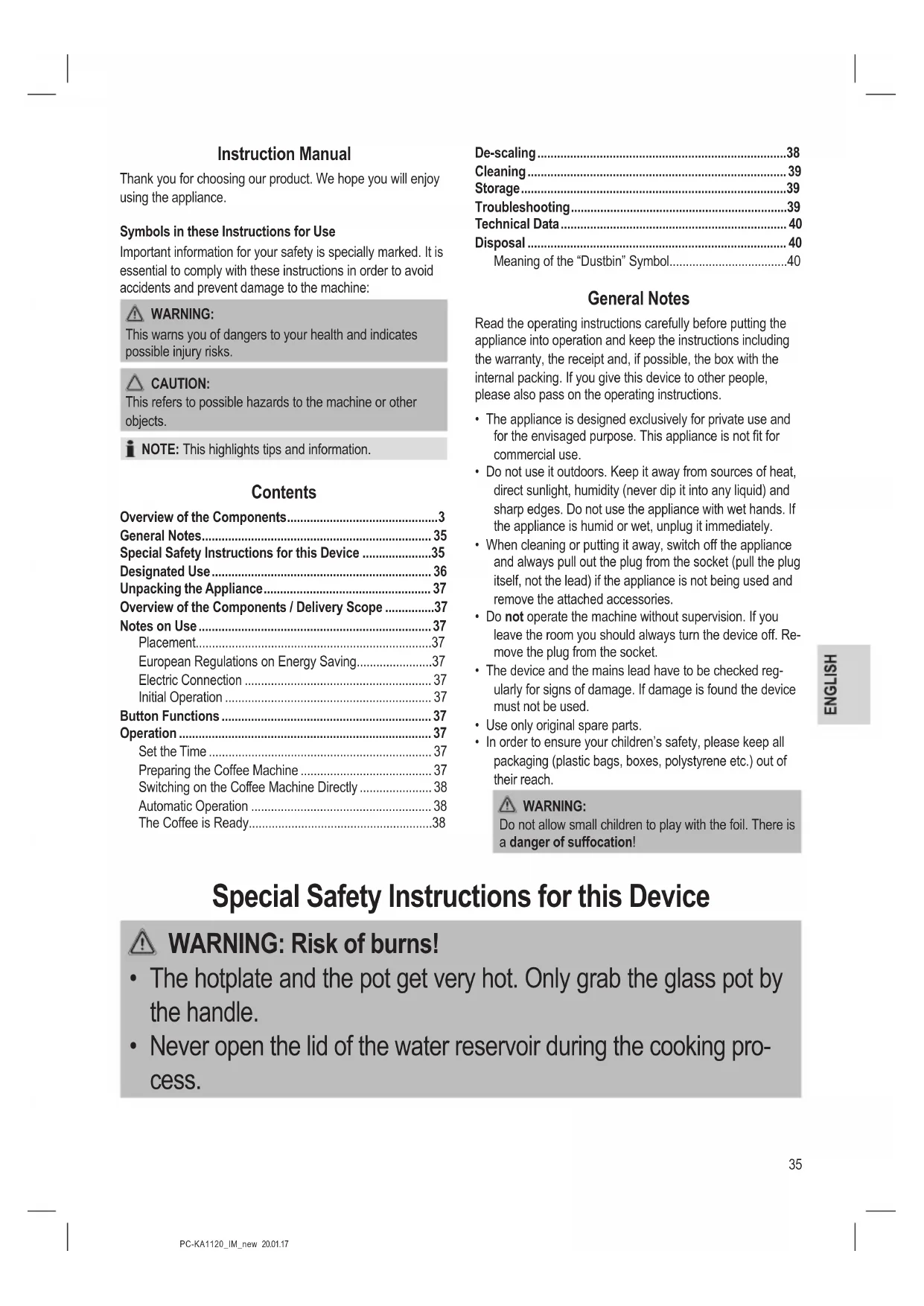 - It is intended for domestic use and similar areas of use such as e. g. - In staff kitchens in shops, ofces and other commercial areas; - By guests in hotels, motels and other accommodation facilities.37 PC-KA1120_IM_new 20.01.17 It is not intended for use in farm accommodation or Bed & Break- fast establishments. Unpacking the Appliance