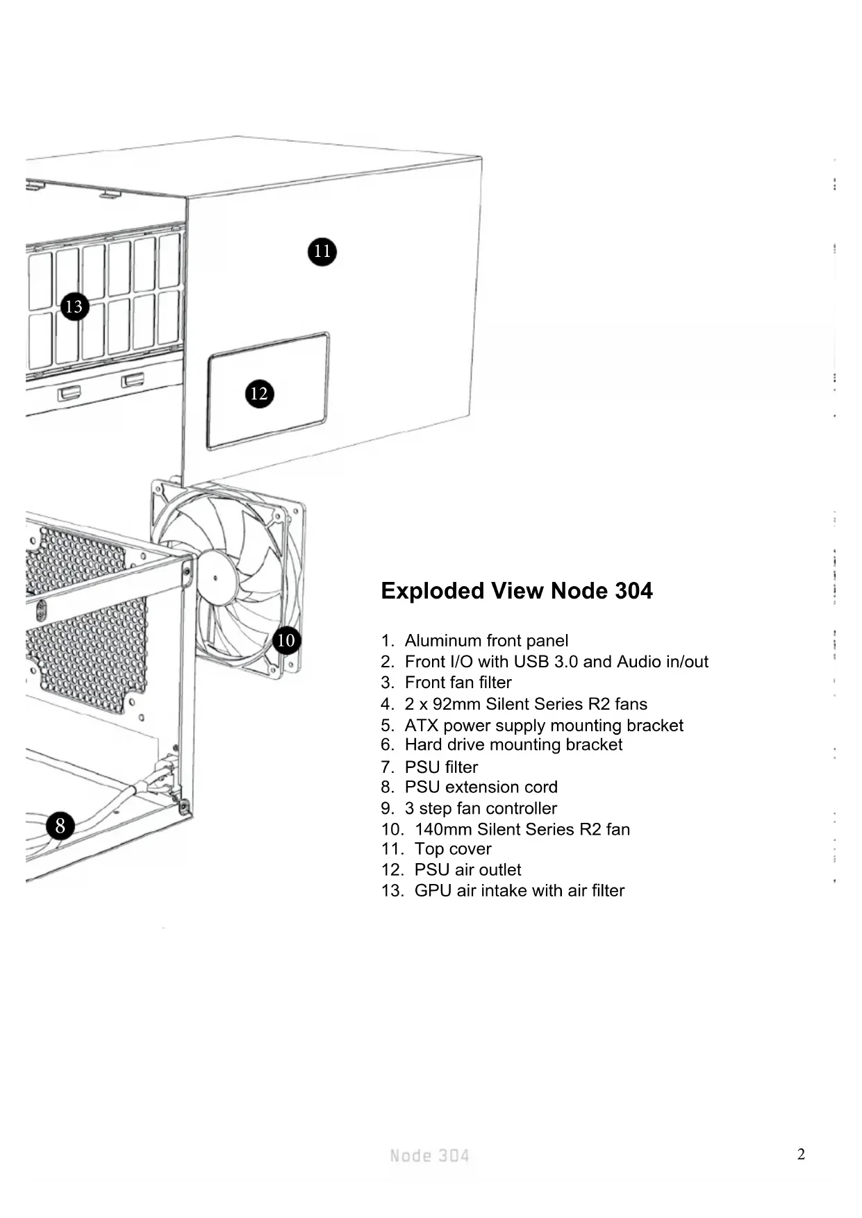 - R 1.0 rev 2.0 Node 304 COMPUTERCASEFractal Design About Fractal Design – our concept Without a doubt, computers are more than just technology - they have become an integral part of our lives. Computers do more than make living easier, they often dene the function- ality and design of our homes, our ofces and ourselves. The products we choose represent how we want to describe the world around us and how we want others to perceive us. Many of us are drawn to designs from Scandinavia, which are organized, clean and functional while remaining stylish, sleek and elegant. We like these designs because they harmonize with our surroundings and become nearly transparent. Brands like Georg Jensen, Bang Olufsen, Skagen Watches and Ikea are just a few that represent this Scandinavian style and efciency. In the world of computer components, there is only one name you should know, Fractal Design. For more information and product specications, visit www.fractal-design.com Europe and Rest of World: support@fractal-design.com North America: support.america@fractal-design.com DACH: support.dach@fractal-design.com China: support.china@fractal-design.com SupportNode 304 Table of Contents: EXPLODED VIEW p. 1