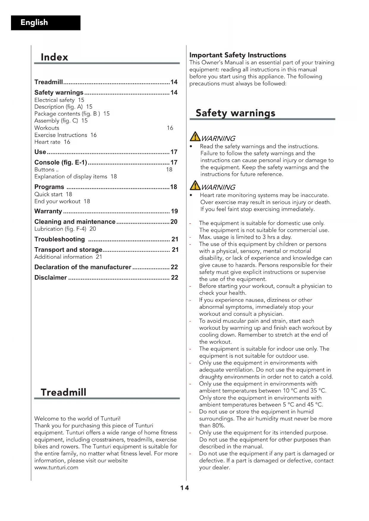 - Disclaimer Treadmill Welcome to the world of Tunturi!Thank you for purchasing this piece of Tunturi equipment. Tunturi offers a wide range of home fitness equipment, including crosstrainers, treadmills, exercise bikes and rowers. The Tunturi equipment is suitable for the entire family, no matter what fitness level. For more information, please visit our website www.tunturi.com Important Safety Instructions This Owner’s Manual is an essential part of your training equipment: reading all instructions in this manual before you start using this appliance. The following precautions must always be followed: Safety warnings WARNING p. 22