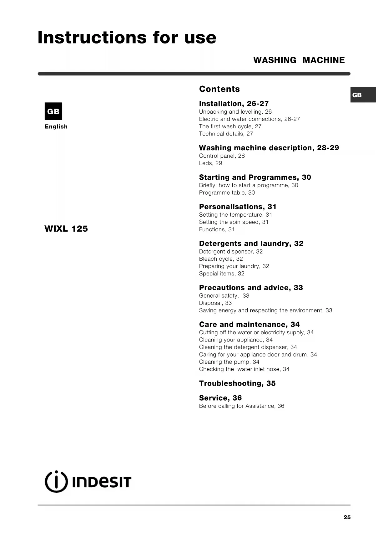 English Contents Installation, 26-27 Unpacking and levelling, 26 Electric and water connections, 26-27 The first wash cycle, 27 Technical details, 27 Washing machine description, 28-29 Control panel, 28 Leds, 29 Starting and Programmes, 30 Briefly: how to start a programme, 30 Programme table, 30 Personalisations, 31 Setting the temperature, 31 Setting the spin speed, 31 Functions, 31 Detergents and laundry, 32 Detergent dispenser, 32 Bleach cycle, 32 Preparing your laundry, 32 Special items, 32 Precautions and advice, 33 General safety, 33 Disposal, 33 Saving energy and respecting the environment, 33 Care and maintenance, 34 Cutting off the water or electricity supply, 34 Cleaning your appliance, 34 Cleaning the detergent dispenser, 34 Caring for your appliance door and drum, 34 Cleaning the pump, 34 Checking the water inlet hose, 34 Troubleshooting, 35 Service, 36 Before calling for Assistance, 36 WASHING MACHINE WIXL 125 Instructions for use GB26