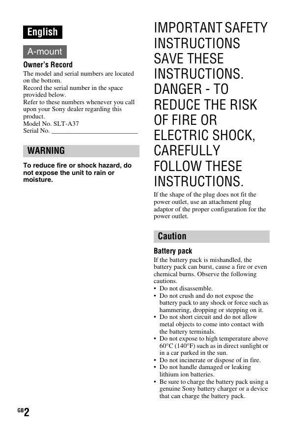 A-mount Owner’s Record The model and serial numbers are located on the bottom. Record the serial number in the space provided below. Refer to these numbers whenever you call upon your Sony dealer regarding this product. Model No. SLT-A37 Serial No. __________________________