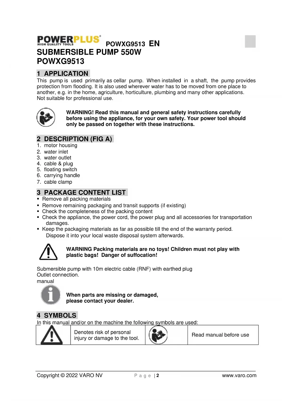 - in a stationary position with a flexible hose pipe. Please note! You should never install the pump by suspending it unsupported from its delivery pipe or power cable. The submersible pump must be suspended from the specially provided handle or be placed on the bottom of the shaft. To guarantee that the pump works properly, the bottom of the shaft must be kept free of sludge and dirt of all kinds. If the level of water sinks too far, any sludge in the shaft will dry out quickly and stop the pump from starting up. ,Therefore it is necessary to check the submersible motor pump regularly (by carrying out start-up tests). The floater is adjusted in a way that the pump can immediately be started Note! The pump shaft should have minimum dimensions of 40 x 40 x 50 cm, so that the floating switch can move freely.POWXG9513 EN Copyright © 2022 VARO NV P a g e | 4 www.varo.com Mains supply Your new submersible pump is equipped with a shock-proof plug according to regulations. The pump is designed to be connected to a 230V - 50 Hz earthed socket. Make sure that the socket is sufficiently secured (min. 6 Amp.) and is in excellent condition. Introduce the plug into the socket and the pump is ready to go. Important Note! If the mains cable or plug suffers any damage from external action, repairs to the cable should be serviced by a qualified specialist using only standard spare parts. This will ensure that it meets the required safety standards.