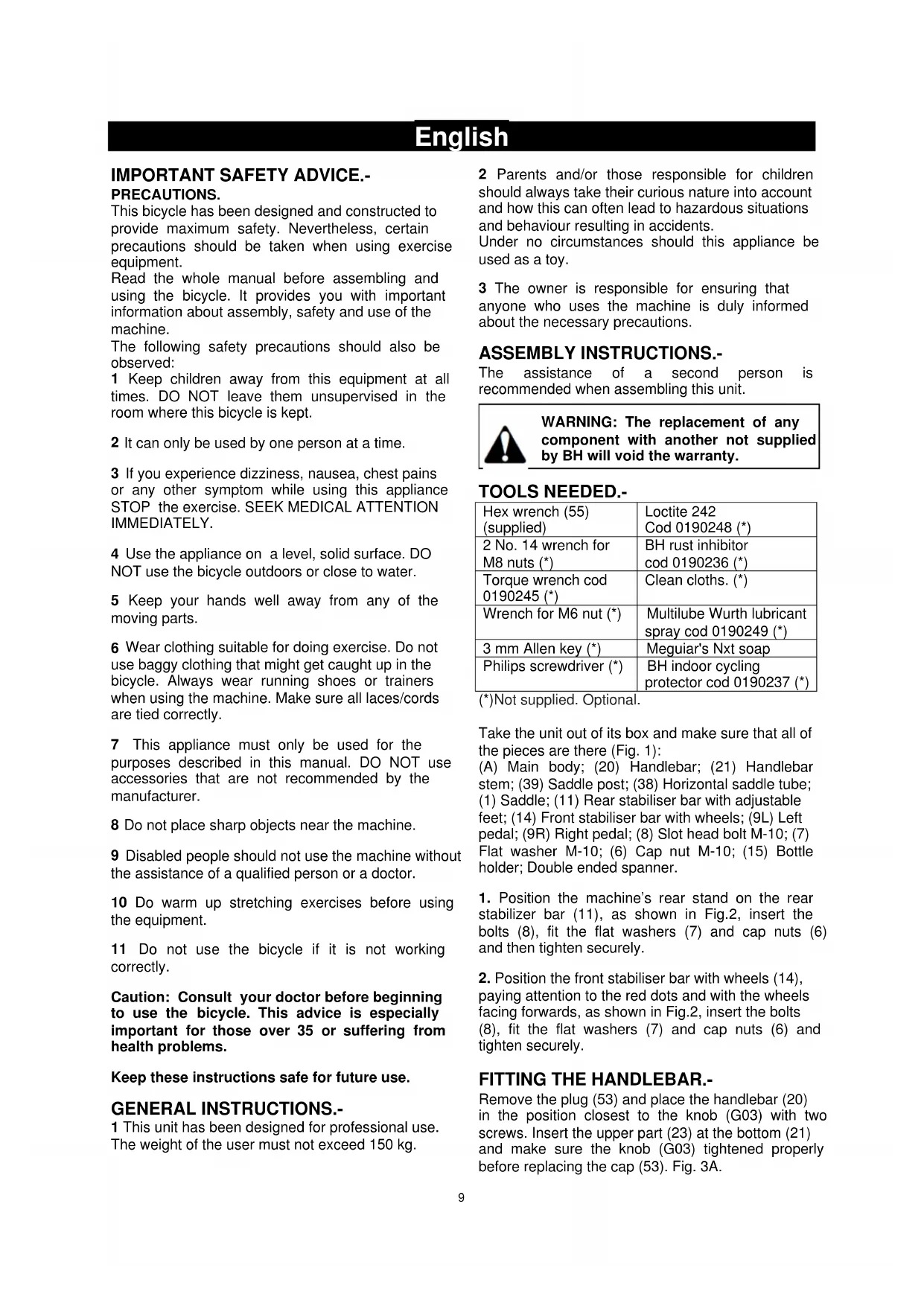 component with another not supplied by BH will void the warranty. TOOLS NEEDED.- Hex wrench (55) (supplied) Loctite 242 Cod 0190248 (*) 2 No. 14 wrench for M8 nuts (*) BH rust inhibitor cod 0190236 (*) Torque wrench cod 0190245 (*) Clean cloths. (*) Wrench for M6 nut (*) Multilube Wurth lubricant spray cod 0190249 (*) 3 mm Allen key (*) Meguiar's Nxt soap Philips screwdriver (*) BH indoor cycling protector cod 0190237 (*) (*)Not supplied. Optional. Take the unit out of its box and make sure that all of the pieces are there (Fig. 1): (A) Main body; (20) Handlebar; (21) Handlebar stem; (39) Saddle post; (38) Horizontal saddle tube; (1) Saddle; (11) Rear stabiliser bar with adjustable feet; (14) Front stabiliser bar with wheels; (9L) Left pedal; (9R) Right pedal; (8) Slot head bolt M-10; (7) Flat washer M-10; (6) Cap nut M-10; (15) Bottle holder; Double ended spanner.