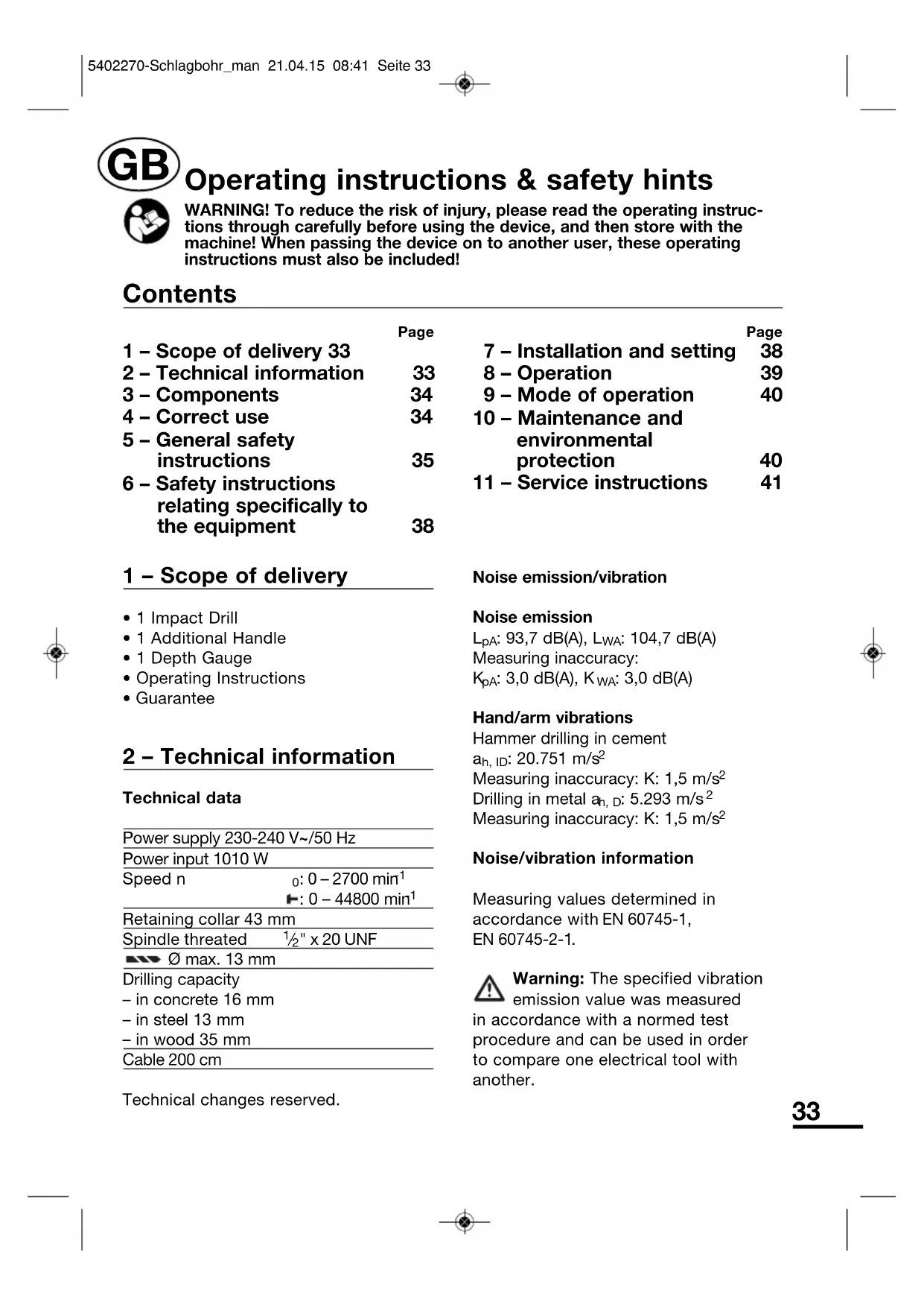 5402270-Schlagbohr_man 21.04.15 08:41 Seite 33The specified vibration emission value can also be used for an introductory evaluation of the influence. The actual vibration emission value present during the use of the machine may deviate from the specification given in the operating instructions or made by the manufacturer. This may be caused by the following influencing factors that should be taken into account prior to and during each use: