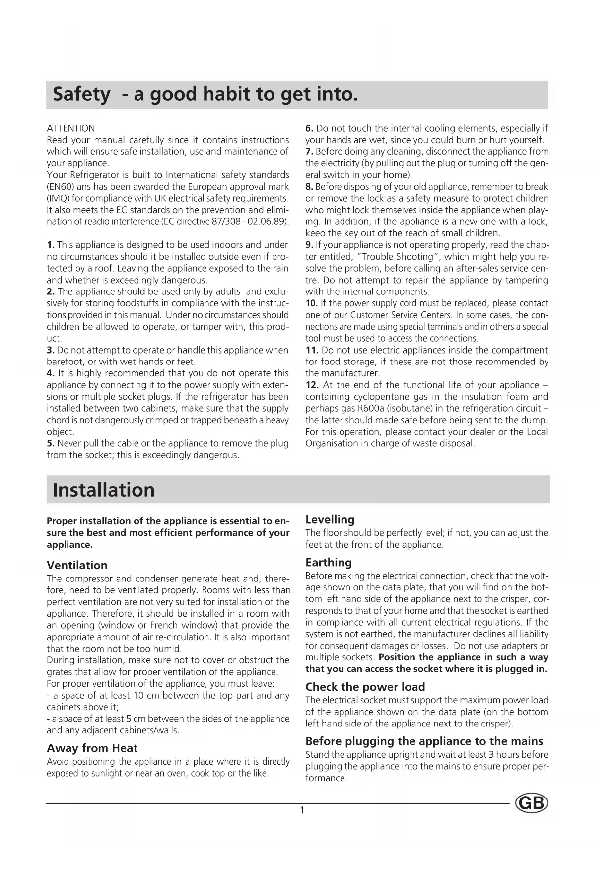 containing cyclopentane gas in the insulation foam and perhaps gas R600a (isobutane) in the refrigeration circuit – the latter should made safe before being sent to the dump. For this operation, please contact your dealer or the Local Organisation in charge of waste disposal. Installation Proper installation of the appliance is essential to en- sure the best and most efficient performance of your appliance. Ventilation The compressor and condenser generate heat and, there- fore, need to be ventilated properly. Rooms with less than perfect ventilation are not very suited for installation of the appliance. Therefore, it should be installed in a room with an opening (window or French window) that provide the appropriate amount of air re-circulation. It is also important that the room not be too humid. During installation, make sure not to cover or obstruct the grates that allow for proper ventilation of the appliance. For proper ventilation of the appliance, you must leave: - a space of at least 10 cm between the top part and any cabinets above it; - a space of at least 5 cm between the sides of the appliance and any adjacent cabinets/walls. Away from Heat Avoid positioning the appliance in a place where it is directly exposed to sunlight or near an oven, cook top or the like. Levelling The floor should be perfectly level; if not, you can adjust the feet at the front of the appliance. Earthing Before making the electrical connection, check that the volt- age shown on the data plate, that you will find on the bot- tom left hand side of the appliance next to the crisper, cor- responds to that of your home and that the socket is earthed in compliance with all current electrical regulations. If the system is not earthed, the manufacturer declines all liability for consequent damages or losses. Do not use adapters or multiple sockets. Position the appliance in such a way that you can access the socket where it is plugged in. Check the power load The electrical socket must support the maximum power load of the appliance shown on the data plate (on the bottom left hand side of the appliance next to the crisper). Before plugging the appliance to the mains Stand the appliance upright and wait at least 3 hours before plugging the appliance into the mains to ensure proper per- formance. Safety - a good habit to get into.2