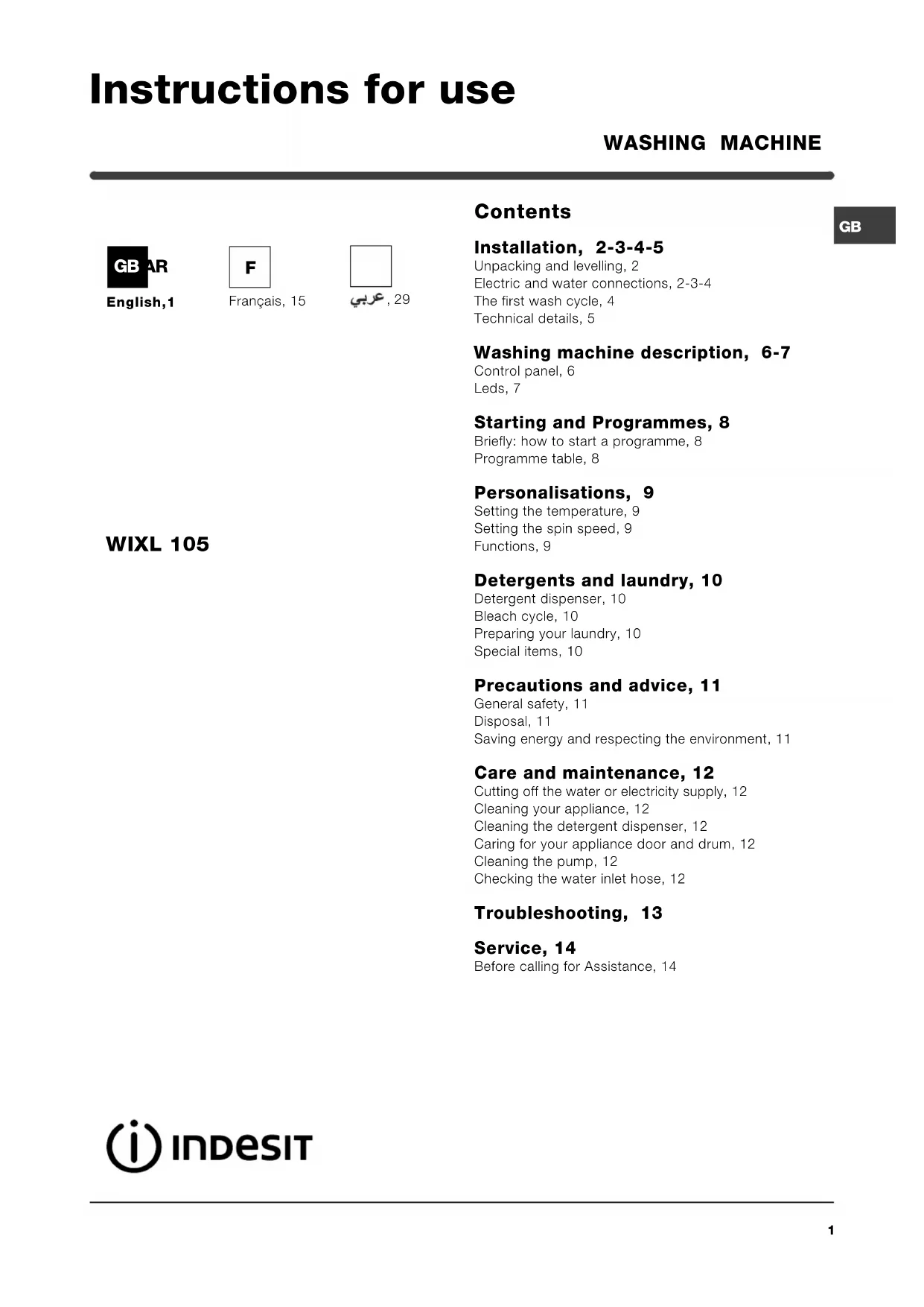 Contents Installation, 2-3-4-5 Unpacking and levelling, 2 Electric and water connections, 2-3-4 The first wash cycle, 4 Technical details, 5 Washing machine description, 6-7 Control panel, 6 Leds, 7 Starting and Programmes, 8 Briefly: how to start a programme, 8 Programme table, 8 Personalisations, 9 Setting the temperature, 9 Setting the spin speed, 9 Functions, 9 Detergents and laundry, 10 Detergent dispenser, 10 Bleach cycle, 10 Preparing your laundry, 10 Special items, 10 Precautions and advice, 11 General safety, 11 Disposal, 11 Saving energy and respecting the environment, 11 Care and maintenance, 12 Cutting off the water or electricity supply, 12 Cleaning your appliance, 12 Cleaning the detergent dispenser, 12 Caring for your appliance door and drum, 12 Cleaning the pump, 12 Checking the water inlet hose, 12 Troubleshooting, 13 Service, 14 Before calling for Assistance, 14 WASHING MACHINE WIXL 105 Instructions for use GB AR English,1 , 29