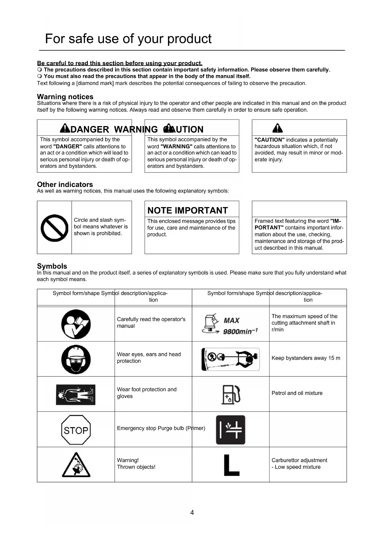 This symbol accompanied by the word "DANGER" calls attentions to an act or a condition which will lead to serious personal injury or death of op-erators and bystanders.This symbol accompanied by the word "WARNING" calls attentions to an act or a condition which can lead to serious personal injury or death of op-erators and bystanders."CAUTION" indicates a potentially hazardous situation which, if not avoided, may result in minor or mod-erate injury.Circle and slash sym-bol means whatever is shown is prohibited. NOTE IMPORTANT This enclosed message provides tips for use, care and maintenance of the product.Framed text featuring the word "IM-PORTANT" contains important infor-mation about the use, checking, maintenance and storage of the prod-uct described in this manual.Symbol form/shape Symbol description/applica- tion Symbol form/shape Symbol description/applica- tion Carefully read the operator's manualThe maximum speed of the cutting attachment shaft in r/minWear eyes, ears and head protectionKeep bystanders away 15 mWear foot protection and glovesPetrol and oil mixtureEmergency stop Purge bulb (Primer)Warning!Thrown objects!Carburettor adjustment- Low speed mixture5 For safe use of your product Warning, side thrust Carburettor adjustment - High speed mixture Usage without shield not per- mitted Carburettor adjustment - Idle speed Usage of metal blades not permitted U-handle Usage of nylon line cutting head not permitted Loop handle Do not use the product in plac- es with poor ventilation Beware of high-temperature areas Beware of fire Guaranteed sound power lev-