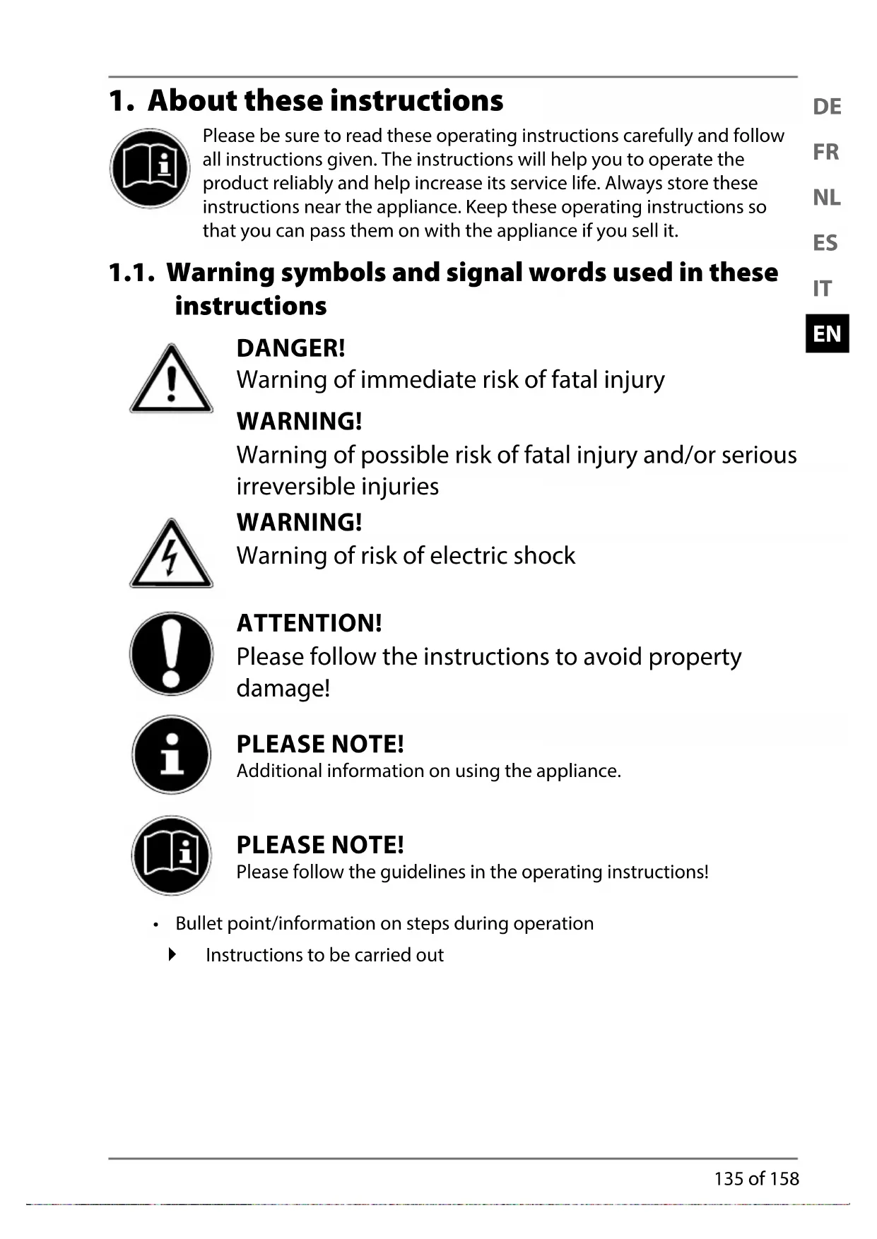 Please be sure to read these operating instructions carefully and follow all instructions given. The instructions will help you to operate the product reliably and help increase its service life. Always store these instructions near the appliance. Keep these operating instructions so that you can pass them on with the appliance if you sell it. 1.1. Warning symbols and signal words used in these instructions DANGER! Warning of immediate risk of fatal injury WARNING! Warning of possible risk of fatal injury and/or serious irreversible injuries WARNING! Warning of risk of electric shock ATTENTION! Please follow the instructions to avoid property damage! PLEASE NOTE! Additional information on using the appliance. PLEASE NOTE! Please follow the guidelines in the operating instructions!