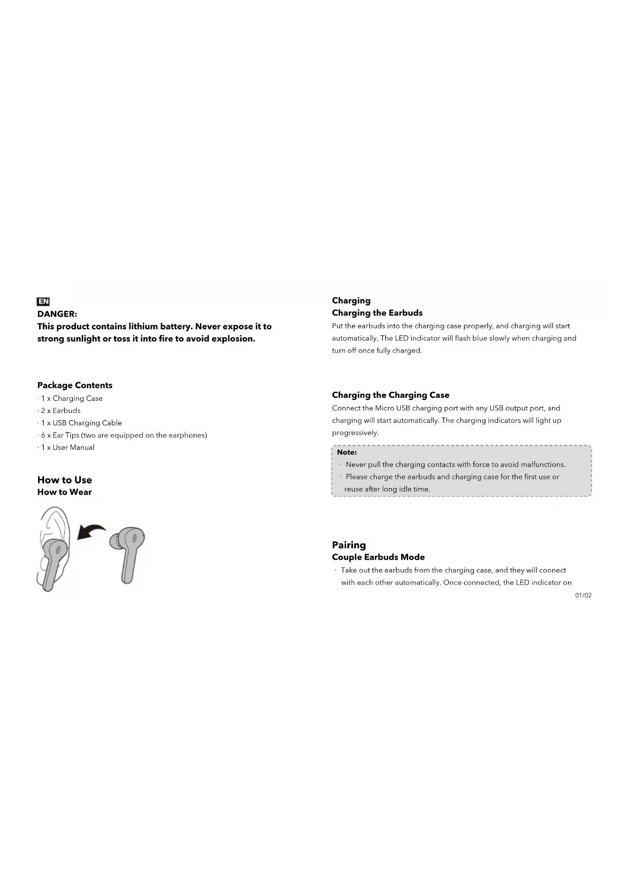 - 1 x User Manual How to Use How to Wear Charging the Charging Case Connect the Micro USB charging port with any USB output port, and charging will start automatically. The charging indicators will light up progressively. Note: