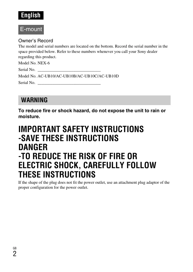 English E-mount Owner’s Record The model and serial numbers are located on the bottom. Record the serial number in the space provided below. Refer to these numbers whenever you call your Sony dealer regarding this product. Model No. NEX-6 Serial No. ______________________________ Model No. AC-UB10/AC-UB10B/AC-UB10C/AC-UB10D Serial No. ______________________________ WARNING To reduce fire or shock hazard, do not expose the unit to rain or moisture.