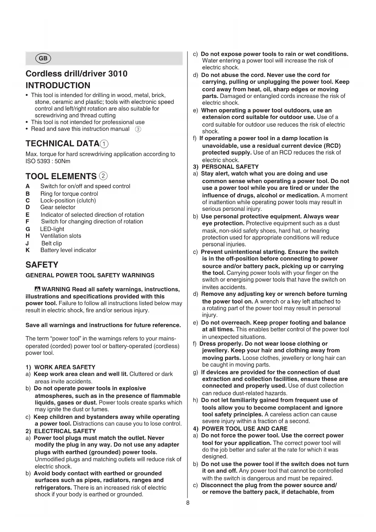 A Switch for on/o and speed control B Ring for torque control C Lock-position (clutch) D Gear selector E Indicator of selected direction of rotation F Switch for changing direction of rotation G LED-light H Ventilation slots J Belt clip K Battery level indicator SAFETY