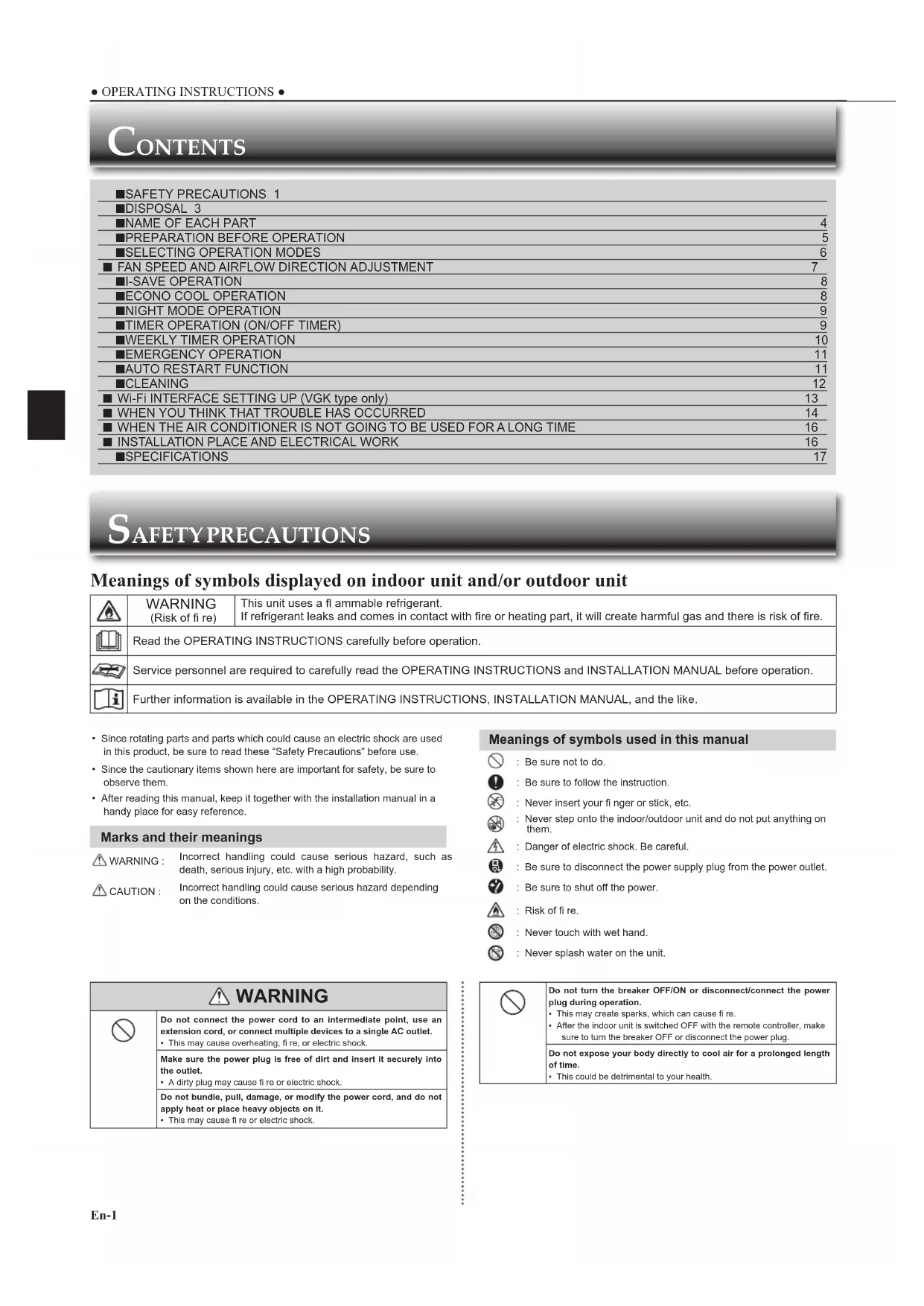 ■ SPECIFICATIONS 17 JG79Y259H03_en.indd 1 2017/10/12 14:02:40En-2En-2 The unit should not be installed, relocated, disassembled, altered, or repaired by the user.• An improperly handled air conditioner may cause fi re, electric shock, injury, or water leakage, etc. Consult your dealer.• If the power supply cord is damaged, it must be replaced by the manu-facturer or its service agent in order to avoid a hazard.When installing, relocating, or servicing the unit, make sure that no substance other than the specifi ed refrigerant (R32) enters the refrigerant circuit.• Any presence of foreign substance such as air can cause abnormal pressure rise and may result in explosion or injury.• The use of any refrigerant other than that specifi ed for the system will cause mechanical failure, system malfunction, or unit breakdown. In the worst case, this could lead to a serious impediment to securing product safety.This appliance is not intended for use by persons (including children) with reduced physical, sensory or mental capabilities, or lack of ex-perience and knowledge, unless they have been given supervision or instruction concerning use of the appliance by a person responsible for their safety.Children should be supervised to ensure that they do not play with the appliance. Do not insert your fi nger, a stick, or other objects into the air inlet or outlet.• This may cause injury, since the fan inside rotates at high speeds during operation. In case of an abnormal condition (such as a burning smell), stop the air conditioner and disconnect the power plug or turn the breaker OFF.• A continued operation in the abnormal state may cause a malfunction, fi re, or electric shock. In this case, consult your dealer. When the air conditioner does not cool or heat, there is a possibility of refrigerant leakage. If any refrigerant leakage is found, stop operations and ventilate the room well and consult your dealer immediately. If a repair involves recharging the unit with refrigerant, ask the service technician for details.• The refrigerant used in the air conditioner is not harmful. Normally, it does not leak. However, if refrigerant leaks and comes in contact with fi re or heating part of such a fan heater, kerosene heater, or cooking stove, it will create harmful gas and there is risk of fi re.The user should never attempt to wash the inside of the indoor unit. Should the inside of the unit require cleaning, contact your dealer.• Unsuitable detergent may cause damage to plastic material inside the unit, which may result in water leakage. Should detergent come in contact with electrical parts or the motor, it will result in a malfunction, smoke, or fi re.• The appliance shall be stored in a room without continuously operating ignition sources (for example: open fl ames, an operating gas appliance or an operating electric heater).• Be aware that refrigerants may not contain an odour.• Do not use means to accelerate the defrosting process or to clean the appliance, other than those recommended by the manufacturer.• Do not pierce or burn.The indoor unit must be installed in rooms which exceed the fl oor space specifi ed. Please consult your dealer.• AP50: 1.7 m²This appliance is intended to be used by expert or trained users in shops, in light industry and on farms, or for commercial use by lay persons. CAUTION Do not touch the air inlet or the aluminum fi ns of the indoor/outdoor unit.• This may cause injury.Do not use insecticides or fl ammable sprays on the unit.• This may cause a fi re or deformation of the unit.Do not expose pets or houseplants to direct airfl ow.• This may cause injury to the pets or plants.Do not place other electric appliances or furniture under the indoor/outdoor unit.• Water may drip down from the unit, which may cause damage or malfunction.Do not leave the unit on a damaged installation stand.• The unit may fall and cause injury.Do not step on an unstable bench to operate or clean the unit.• This may cause injury if you fall down.Do not pull the power cord.• This may cause a portion of the core wire to break, which may cause overheating or fi re.Do not charge or disassemble the batteries, and do not throw them into a fi re. This may cause the batteries to leak, or cause a fi re or explosion. SAFETY PRECAUTIONS Do not operate the unit for more than 4 hours at high humidity (80% RH or more) and/or with windows or outside door left open.• This may cause the water condensation in the air conditioner, which may drip down, wetting or damaging the furniture. • The water condensation in the air conditioner may contribute to growth of fungi, such as mold.Do not use the unit for special purposes, such as storing food, raising animals, growing plants, or preserving precision devices or art objects.• This may cause deterioration of quality, or harm to animals and plants.Do not expose combustion appliances to direct airfl ow.• This may cause incomplete combustion.Never put batteries in your mouth for any reason to avoid accidental ingestion.• Battery ingestion may cause choking and/or poisoning.Before cleaning the unit, switch it OFF and disconnect the power plug or turn the breaker OFF.• This may cause injury, since the fan inside rotates at high speeds during operation.When the unit will be unused for a long time, disconnect the power plug or turn the breaker OFF.• The unit may accumulate dirt, which may cause overheating or fi re.Replace all batteries of the remote controller with new ones of the same type.• Using an old battery together with a new one may cause overheating, leakage, or explosion.If the battery fl uid comes in contact with your skin or clothes, wash them thoroughly with clean water. If the battery fl uid comes in contact with your eyes, wash them thoroughly with clean water and immediately seek medical attention.Ensure that the area is well-ventilated when the unit is operated together with a combustion appliance.