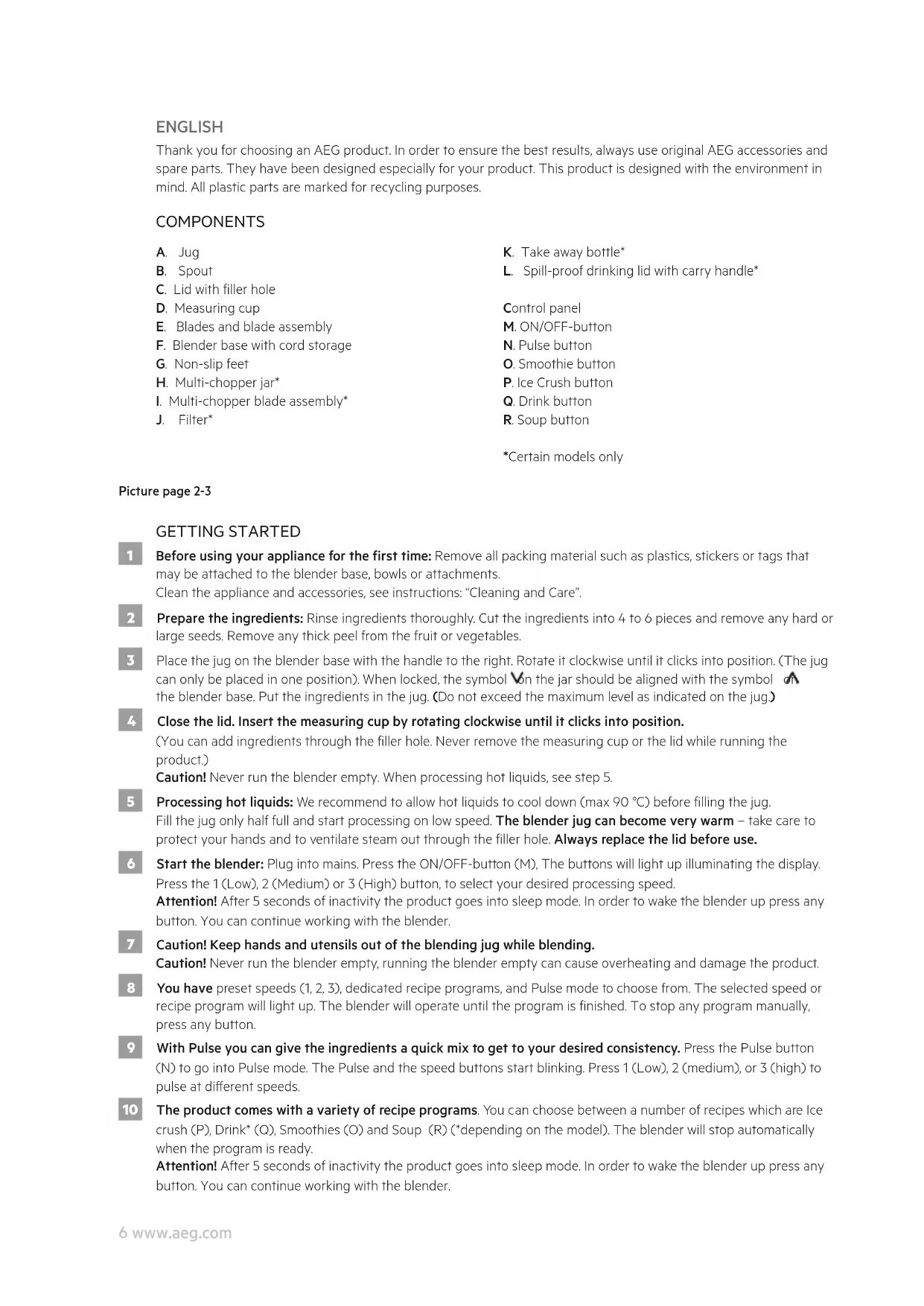 J. Filter* K. Take away bottle* L. Spill-proof drinking lid with carry handle* Control panel M. ON/OFF-button N. Pulse button O. Smoothie button P. Ice Crush button Q. Drink button R. Soup button *Certain models only Picture page 2-3 GETTING STARTED 1 Before using your appliance for the rst time: Remove all packing material such as plastics, stickers or tags that may be attached to the blender base, bowls or attachments. Clean the appliance and accessories, see instructions: “Cleaning and Care”. 2 Prepare the ingredients: Rinse ingredients thoroughly. Cut the ingredients into 4 to 6 pieces and remove any hard or large seeds. Remove any thick peel from the fruit or vegetables. 3 Place the jug on the blender base with the handle to the right. Rotate it clockwise until it clicks into position. (The jug can only be placed in one position). When locked, the symbol on the jar should be aligned with the symbol on the blender base. Put the ingredients in the jug. (Do not exceed the maximum level as indicated on the jug.) 4 Close the lid. Insert the measuring cup by rotating clockwise until it clicks into position. (You can add ingredients through the ller hole. Never remove the measuring cup or the lid while running the product.) Caution! Never run the blender empty. When processing hot liquids, see step 5. 5 Processing hot liquids: We recommend to allow hot liquids to cool down (max 90 °C) before lling the jug. Fill the jug only half full and start processing on low speed. The blender jug can become very warm – take care to protect your hands and to ventilate steam out through the ller hole. Always replace the lid before use. 6 Start the blender: Plug into mains. Press the ON/OFF-button (M), The buttons will light up illuminating the display. Press the 1 (Low), 2 (Medium) or 3 (High) button, to select your desired processing speed. Attention! After 5 seconds of inactivity the product goes into sleep mode. In order to wake the blender up press any button. You can continue working with the blender. 7 Caution! Keep hands and utensils out of the blending jug while blending. Caution! Never run the blender empty, running the blender empty can cause overheating and damage the product. 8 You have preset speeds (1, 2, 3), dedicated recipe programs, and Pulse mode to choose from. The selected speed or recipe program will light up. The blender will operate until the program is nished. To stop any program manually, press any button. 9 With Pulse you can give the ingredients a quick mix to get to your desired consistency. Press the Pulse button (N) to go into Pulse mode. The Pulse and the speed buttons start blinking. Press 1 (Low), 2 (medium), or 3 (high) to pulse at dierent speeds. 10 The product comes with a variety of recipe programs. You can choose between a number of recipes which are Ice crush (P), Drink* (Q), Smoothies (O) and Soup (R) (*depending on the model). The blender will stop automatically when the program is ready. Attention! After 5 seconds of inactivity the product goes into sleep mode. In order to wake the blender up press any button. You can continue working with the blender.7www.aeg.com