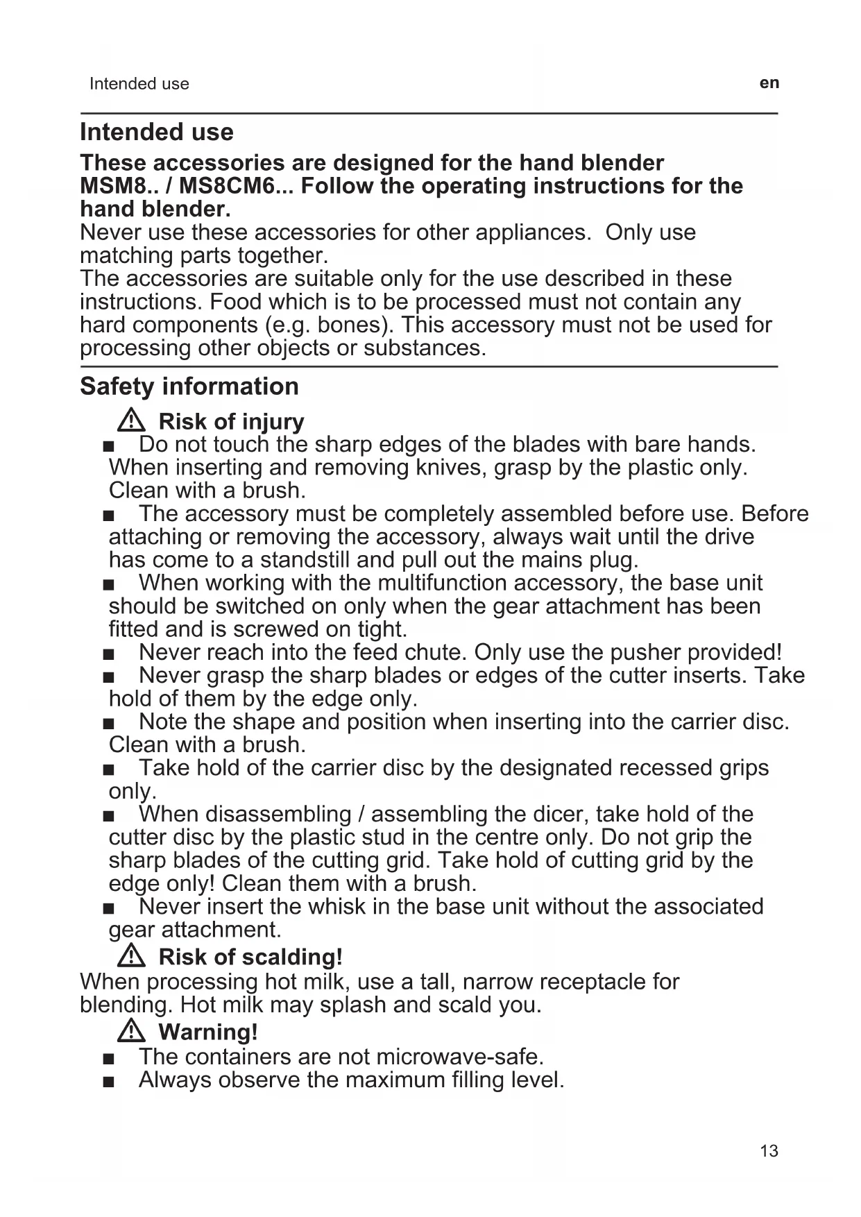 Intended use Intended use These accessories are designed for the hand blender MSM8.. / MS8CM6... Follow the operating instructions for the hand blender. Never use these accessories for other appliances. Only use matching parts together. The accessories are suitable only for the use described in these instructions. Food which is to be processed must not contain any hard components (e.g. bones). This accessory must not be used for processing other objects or substances. Safety information W Risk of injury ■ Do not touch the sharp edges of the blades with bare hands. When inserting and removing knives, grasp by the plastic only. Clean with a brush. ■ The accessory must be completely assembled before use. Before attaching or removing the accessory, always wait until the drive has come to a standstill and pull out the mains plug. ■ When working with the multifunction accessory, the base unit should be switched on only when the gear attachment has been fitted and is screwed on tight. ■ Never reach into the feed chute. Only use the pusher provided! ■ Never grasp the sharp blades or edges of the cutter inserts. Take hold of them by the edge only. ■ Note the shape and position when inserting into the carrier disc. Clean with a brush. ■ Take hold of the carrier disc by the designated recessed grips only. ■ When disassembling / assembling the dicer, take hold of the cutter disc by the plastic stud in the centre only. Do not grip the sharp blades of the cutting grid. Take hold of cutting grid by the edge only! Clean them with a brush. ■ Never insert the whisk in the base unit without the associated gear attachment. W Risk of scalding! When processing hot milk, use a tall, narrow receptacle for blending. Hot milk may splash and scald you. W Warning! ■ The containers are not microwave-safe. ■ Always observe the maximum filling level.14 en Safety information ■ Check that there are no foreign objects in the feed chute or container. Do not insert objects (e.g. knives, spoons) into the feed chute or container. ■ Never use the hand blender (blender foot) in the container. ■ Never immerse the following parts in liquids, hold under running water or clean in the dishwasher: gear attachments, lid with gears. W Important! It is essential to clean the accessory thoroughly after each use or after it has not been used for an extended period. X “Cleaning and maintenance” see page 21 Before use, read these instructions carefully in order to become familiar with important safety and operating instructions for this appliance. Please keep the operating instructions in a safe place. If passing on the appliance to a third party, always include the operating instructions. Overview X Fig. A 1 Universal cutter L * a Container b Universal blade (L) c Ice crusher blade (L) d Gear attachment e Lid 2 Universal cutter XL * a Container b Universal blade (XL) c Gear attachment d Lid 3 Multifunction accessory a Container b Kneading hook c Universal blade d Lid with gears e Pusher f Carrier disc for disc inserts Disc inserts * g Slicing insert – coarse h Slicing insert – fine i Shredding insert – medium j Grating insert – coarse Dicer k Base holder l Cutter disc m Cutting grid, small (approx 9 mm) n Cutting grid, large (approx 13 mm) * o Cutting grid cleaner (head can be rotated for different cutting grids) 4 Whisk* a Gear attachment