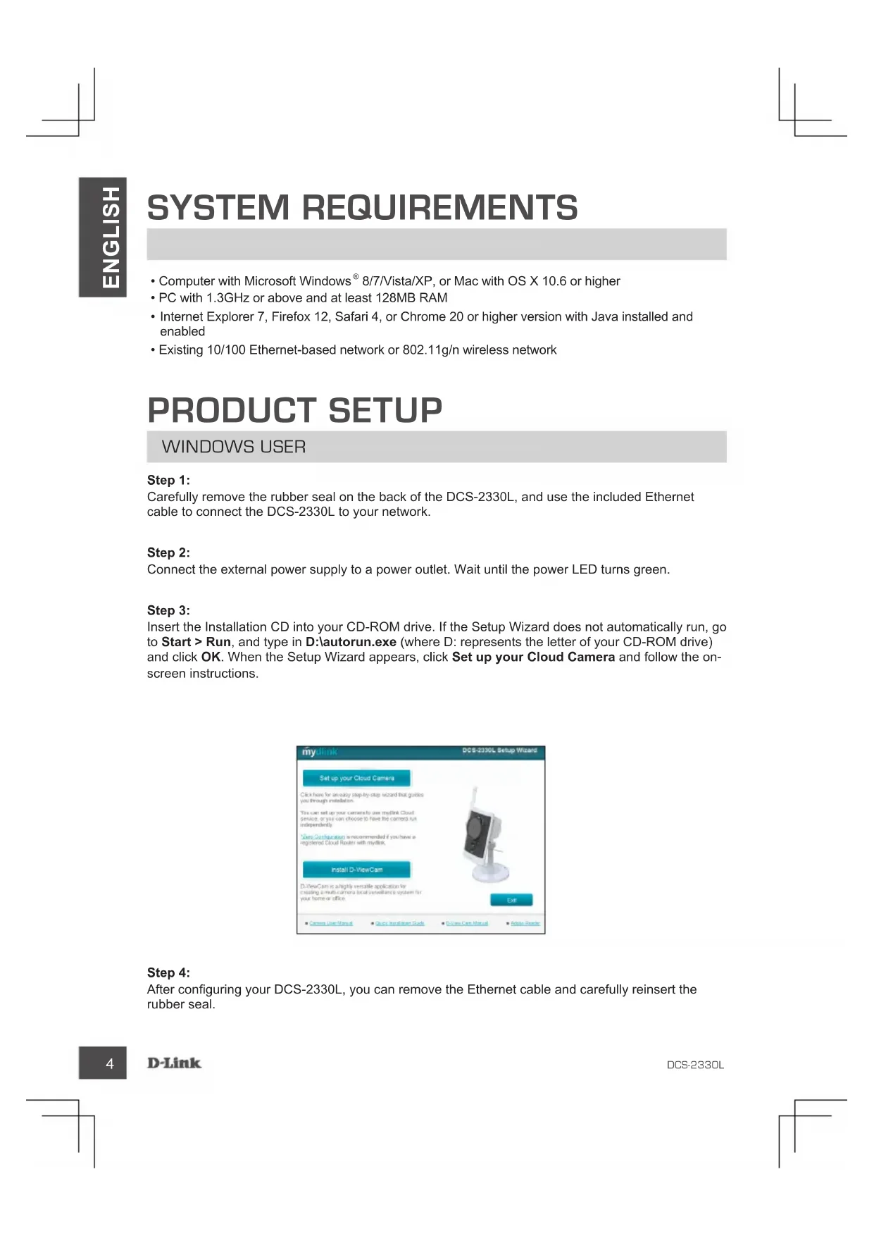 - Existing 10/100 Ethernet-based network or 802.11g/n wireless network SYSTEm rEQuIrEmENTS PrODuCT SETuP WINDOWS USER Step 1: Carefully remove the rubber seal on the back of the DCS-2330L, and use the included Ethernet cable to connect the DCS-2330L to your network. Step 2: Connect the external power supply to a power outlet. Wait until the power LED turns green. Step 3: Insert the Installation CD into your CD-ROM drive. If the Setup Wizard does not automatically run, go to Start > Run, and type in D:\autorun.exe (where D: represents the letter of your CD-ROM drive) and click OK. When the Setup Wizard appears, click Set up your Cloud Camera and follow the on- screen instructions. Step 4: After conguring your DCS-2330L, you can remove the Ethernet cable and carefully reinsert the rubber seal.DCS-2330L
