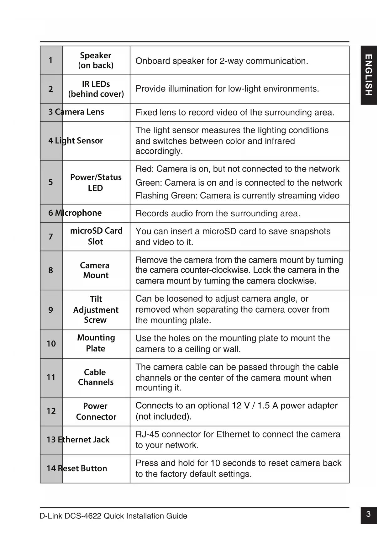 Power Connector Connects to an optional 12 V / 1.5 A power adapter (not included). 13 Ethernet Jack RJ-45 connector for Ethernet to connect the camera to your network. 14 Reset Button Press and hold for 10 seconds to reset camera back to the factory default settings.D-Link DCS-4622 Quick Installation Guide