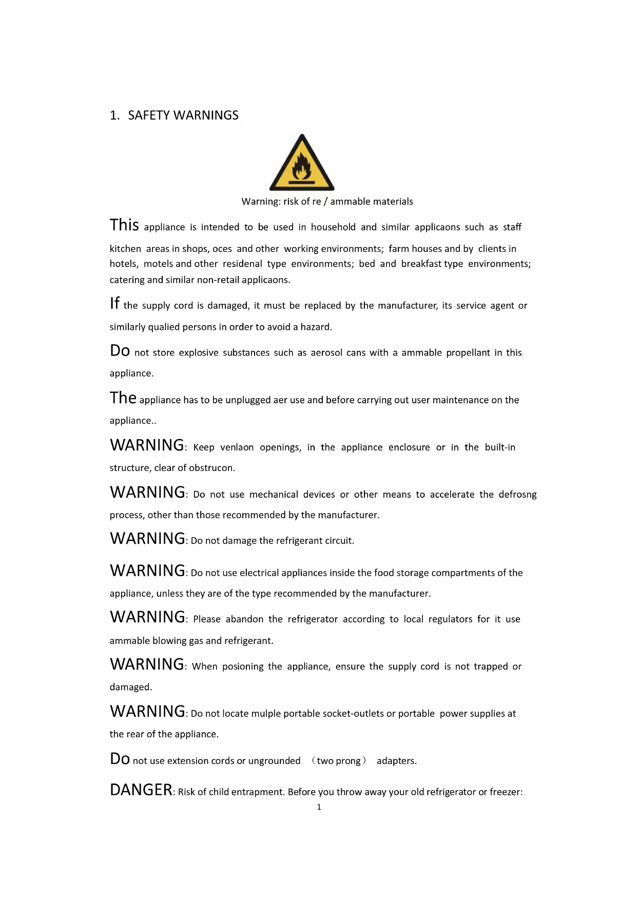 -Take off the doors. -Leave the shelves in place so that children may not easily climb inside. The refrigerator must be disconnected from the source of electrical supply before attempting the installation of accessory. Refrigerant and cyclopentane foaming material used for the refrigerator are flammable. Therefore, when the refrigerator is scrapped it shall be kept away from any fire source and be recovered by a special recovering company with corresponding qualification other than be disposed by combustion, so as to prevent damage to the environment or any other harm. For EN standard: This appliance can be used by children aged from 8 years and above and persons with reduce physical sensory or mental capabilities or lack of experience and knowledge if they have been given supervision or instruction concerning use of the appliance in a safe way and understand the hazards involved. Children shall not play with the appliance. Cleaning and user maintenance shall not be made by children without supervision. Children aged from 3 to 8 years are allowed to load and unload refrigerating appliances. For IEC standard: This appliance is not intended for use by persons (including children) with reduced physical, sensory or mental capabilities, or lack of experience and knowledge, unless they have been given supervision or instruction concerning use of the appliance by a person responsible for their safety.) Children should be supervised to ensure that they do not play with the appliance. The instructions shall include the substance of the following: To avoid contamination of food, please respect the following instructions: –Opening the door for long periods can cause a significant increase of the temperature in the compartments of the appliance. –Clean regularly surfaces that can come in contact with food and accessible drainage systems. –Clean water tanks if they have not been used for 48 h; flush the water system connected to a water supply if water has not been drawn for 5 days. (note 1) –Store raw meat and fish in suitable containers in the refrigerator, so that it is not in contact with or drip onto other food. –Two-star frozen-food compartments are suitable for storing pre-frozen food, storing or making ice-cream and making ice cubes. (note 2) –One -,two -and three-star compartments are not suitable for the freezing of fresh food. (note 3) –If the refrigerating appliance is left empty for long periods, switch off, defrost, clean, dry, and leave the door open to prevent mould developing within the appliance. Note 1,2,3:Please confirm whether it is applicable according to you product compartment type.3