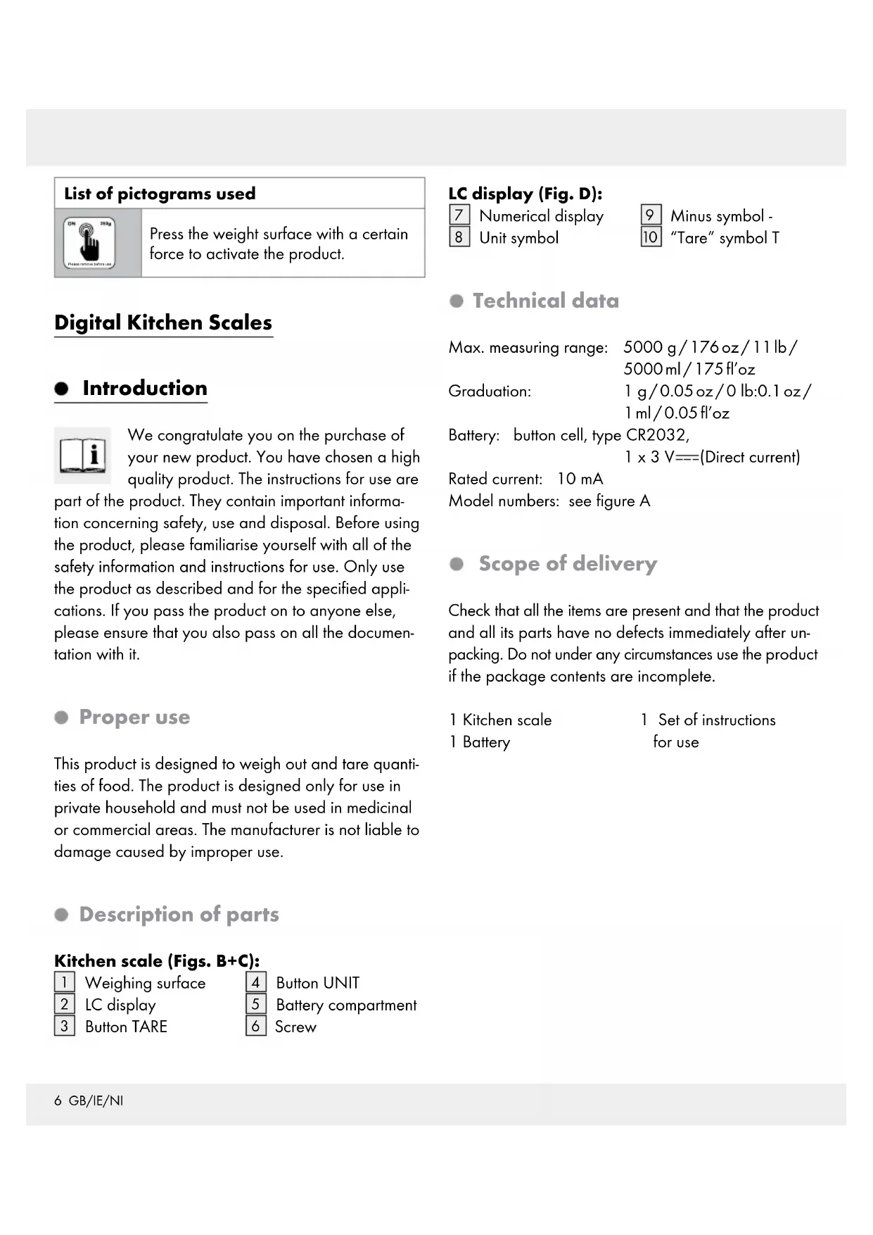 “Tare” symbol T Technical data Max. measuring range: 5000 g / 176 oz / 11 lb / 5000 ml / 175 fl’oz Graduation: 1 g / 0.05 oz / 0 lb:0.1 oz / 1 ml / 0.05 fl’oz Battery: button cell, type CR2032, 1 x 3 V (Direct current) Rated current: 10 mA Model numbers: see figure A Scope of delivery Check that all the items are present and that the product and all its parts have no defects immediately after un- packing. Do not under any circumstances use the p roduct if the package contents are incomplete. 1 Kitchen scale 1 Battery 1 Set of instructions for use7 GB/IE/NI Safety notices