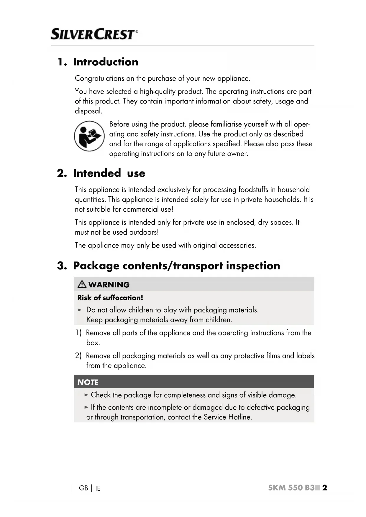 Dear Customer, This appliance has a 3-year warranty valid from the date of purchase. If this product has any faults, you, the buyer, have certain statutory rights. Your stat- utory rights are not restricted in any way by the warranty described below. Warranty conditions The warranty period starts on the date of purchase. Please keep your receipt in a safe place. This will be required as proof of purchase. If any material or manufacturing fault occurs within three years of the date of purchase of the product, we will either repair or replace the product for you or refund the purchase price (at our discretion). This warranty service requires that you present the defective appliance and the proof of purchase (receipt) within the three-year warranty period, along with a brief written description of the fault and of when it occurred. If the defect is covered by the warranty, your product will either be repaired or replaced by us. The repair or replacement of a product does not signify the beginning of a new warranty period. Warranty period and statutory claims for defects The warranty period is not prolonged by repairs effected under the warranty. This also applies to replaced and repaired components. Any damage and defects present at the time of purchase must be reported immediately after unpacking. Repairs carried out after expiry of the warranty period shall be subject to a fee. Scope of the warranty This appliance has been manufactured in accordance with strict quality guidelines and inspected meticulously prior to delivery. The warranty covers material faults or production faults. The warranty does not extend to product parts subject to normal wear and tear or to fragile parts which could be considered as consumable parts such as switches, bat- teries or parts made of glass. The warranty does not apply if the product has been damaged, improperly used or improperly maintained. The directions in the operating instructions for the product regarding proper use of the product are to be strictly followed. Uses and actions that are discouraged in the operating instructions or which are warned against must be avoided.SKM 550 B3 GB