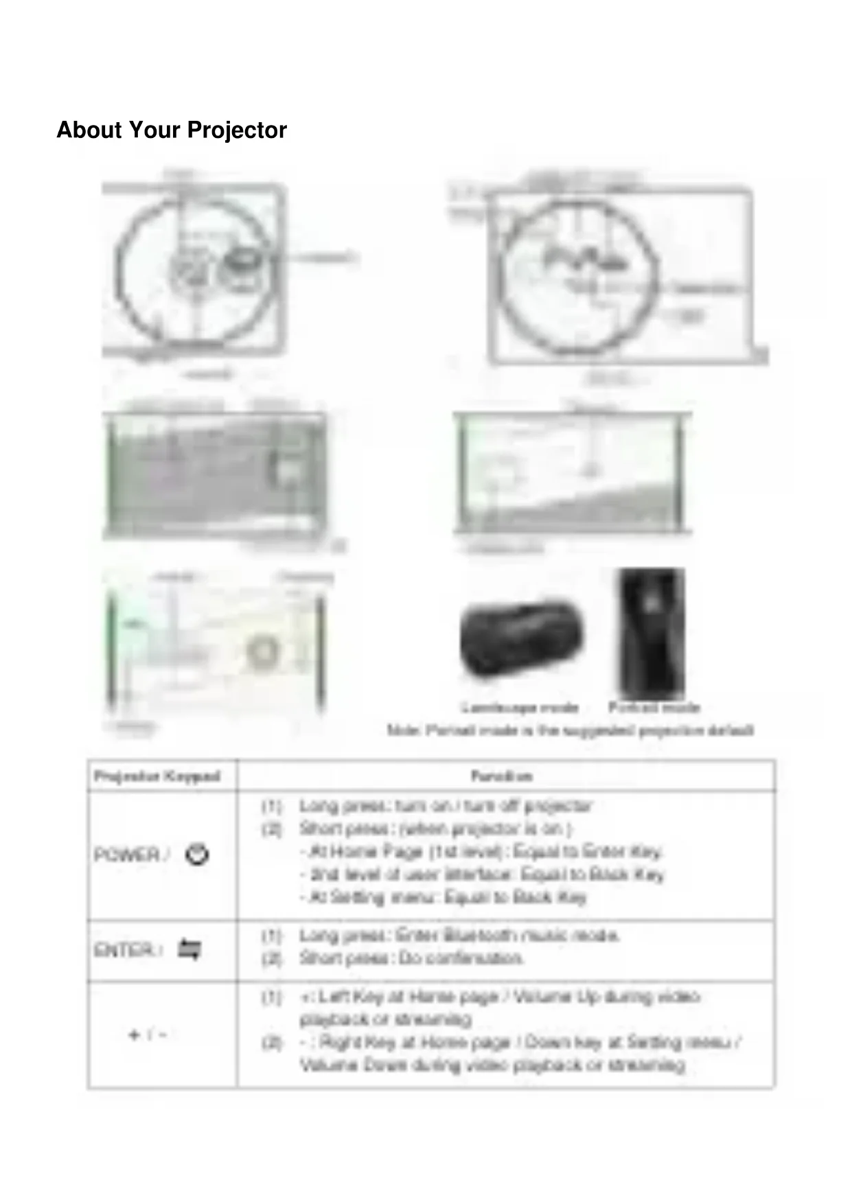 PrecautionsAbout Your Projector Long press: turn on / turn off projector Short press: (when projector is on ) - At Home Page (1st level): Equal to Enter Key. - 2nd level of user interface: Equal to Back Key. - At Setting menu: Equal to Back Key (1) (2) (1) (2) (1) (2) Long press: Enter Bluetooth music mode. Short press: Do confirmation. +: Left Key at Home page / Volume Up during video playback or streaming - : Right Key at Home page / Down key at Setting menu / Volume Down during video playback or streaming POWER / ENTER /
