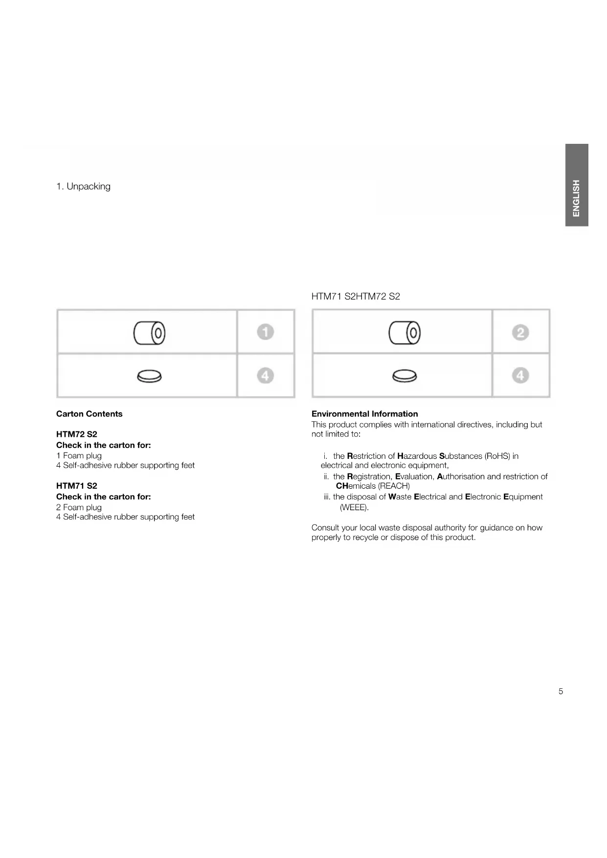 Carton Contents HTM72S2 Check in the carton for: 1 Foam plug 4 Self-adhesive rubber supporting feet HTM71S2 Check in the carton for: 2 Foam plug 4 Self-adhesive rubber supporting feet Environmental Information This product complies with international directives, including but not limited to:
