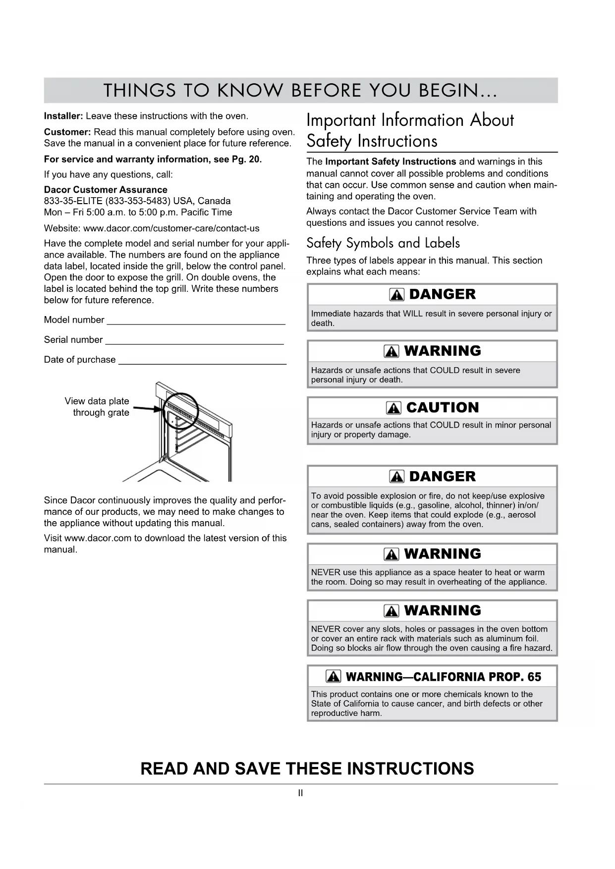 - Français Part No. 113606 Rev AII Installer: Leave these instructions with the oven. Customer: Read this manual completely before using oven. Save the manual in a convenient place for future reference. For service and warranty information, see Pg. 20. If you have any questions, call: Dacor Customer Assurance 833-35-ELITE (833-353-5483) USA, Canada Mon – Fri 5:00 a.m. to 5:00 p.m. Pacic Time Website: www.dacor.com/customer-care/contact-us Have the complete model and serial number for your appli- ance available. The numbers are found on the appliance data label, located inside the grill, below the control panel. Open the door to expose the grill. On double ovens, the label is located behind the top grill. Write these numbers below for future reference. Model number __________________________________ Serial number __________________________________ Date of purchase ________________________________ Since Dacor continuously improves the quality and perfor- mance of our products, we may need to make changes to the appliance without updating this manual. Visit www.dacor.com to download the latest version of this manual. p. 17