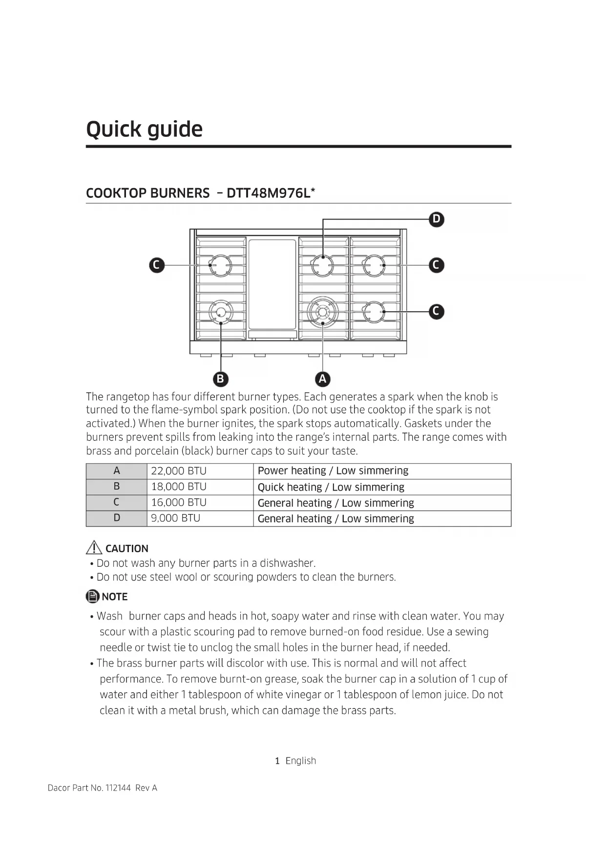 | A | 22,000 BTU | Power heating / Low simmering |