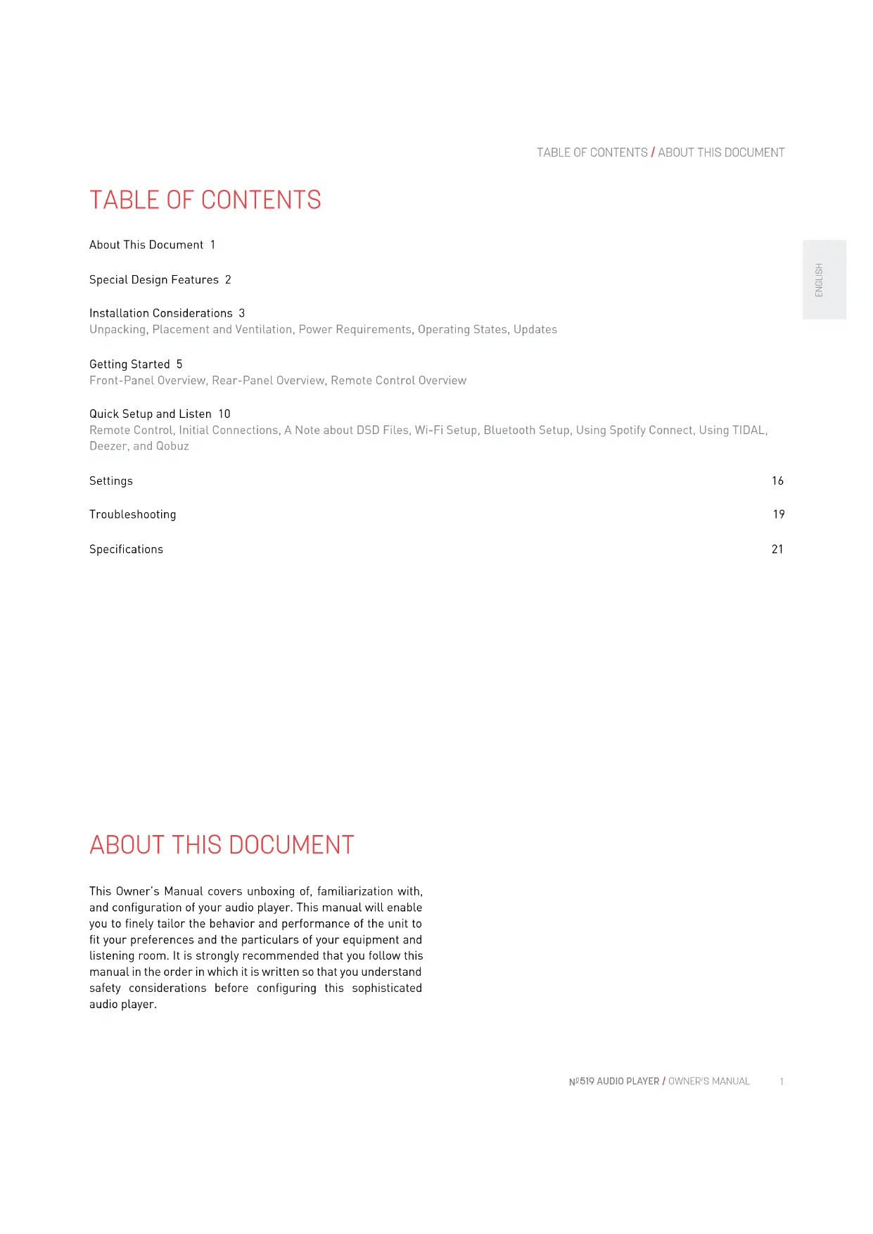 About This Document 1 Special Design Features 2 Installation Considerations 3 Unpacking, Placement and Ventilation, Power Requirements, Operating States, Updates Getting Started 5 Front-Panel Overview, Rear-Panel Overview, Remote Control Overview Quick Setup and Listen 10 Remote Control, Initial Connections, A Note about DSD Files, Wi-Fi Setup, Bluetooth Setup, Using Spotify Connect, Using TIDAL, Deezer, and Qobuz Settings 16 Troubleshooting 19 Specifications 21 This Owner’s Manual covers unboxing of, familiarization with, and configuration of your audio player. This manual will enable you to finely tailor the behavior and performance of the unit to fit your preferences and the particulars of your equipment and listening room. It is strongly recommended that you follow this manual in the order in which it is written so that you understand safety considerations before configuring this sophisticated audio player.