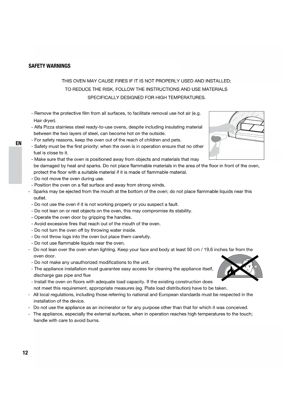 SAFETY WARNINGS THIS OVEN MAY CAUSE FIRES IF IT IS NOT PROPERLY USED AND INSTALLED; TO REDUCE THE RISK, FOLLOW THE INSTRUCTIONS AND USE MATERIALS SPECIFICALLY DESIGNED FOR HIGH TEMPERATURES. - Remove the protective lm from all surfaces, to facilitate removal use hot air (e.g. Hair dryer). - Alfa Pizza stainless steel ready-to-use ovens, despite including insulating material between the two layers of steel, can become hot on the outside. - For safety reasons, keep the oven out of the reach of children and pets. - Safety must be the rst priority: when the oven is in operation ensure that no other fuel is close to it. - Make sure that the oven is positioned away from objects and materials that may be damaged by heat and sparks. Do not place ammable materials in the area of the oor in front of the oven, protect the oor with a suitable material if it is made of ammable material. - Do not move the oven during use. - Position the oven on a at surface and away from strong winds. - Sparks may be ejected from the mouth at the bottom of the oven; do not place ammable liquids near this outlet. - Do not use the oven if it is not working properly or you suspect a fault. - Do not lean on or rest objects on the oven, this may compromise its stability. - Operate the oven door by gripping the handles. - Avoid excessive res that reach out of the mouth of the oven. - Do not turn the oven o by throwing water inside. - Do not throw logs into the oven but place them carefully. - Do not use ammable liquids near the oven. - Do not lean over the oven when lighting. Keep your face and body at least 50 cm / 19,6 inches far from the oven door. - Do not make any unauthorized modications to the unit. - The appliance installation must guarantee easy access for cleaning the appliance itself, discharge gas pipe and ue - Install the oven on oors with adequate load capacity. If the existing construction does not meet this requirement, appropriate measures (eg. Plate load distribution) have to be taken. - All local regulations, including those referring to national and European standards must be respected in the installation of the device. - Do not use the appliance as an incinerator or for any purpose other than that for which it was conceived. - The appliance, especially the external surfaces, when in operation reaches high temperatures to the touch; handle with care to avoid burns.13