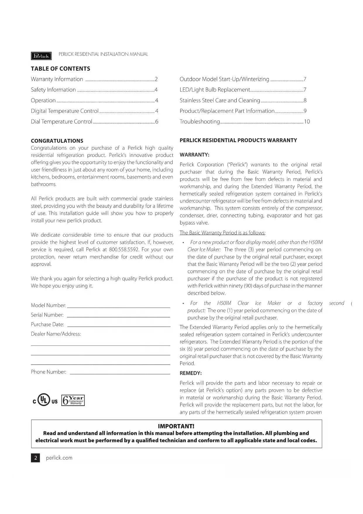 - Troubleshooting CONGRATULATIONS Congratulations on your purchase of a Perlick high quality residential refrigeration product. Perlick’s innovative product oering gives you the opportunity to enjoy the functionality and user friendliness in just about any room of your home, including kitchens, bedrooms, entertainment rooms, basements and even bathrooms. All Perlick products are built with commercial grade stainless steel, providing you with the beauty and durability for a lifetime of use. This installation guide will show you how to properly install your new perlick product. We dedicate considerable time to ensure that our products provide the highest level of customer satisfaction. If, however, service is required, call Perlick at 800.558.5592. For your own protection, never return merchandise for credit without our approval. We thank you again for selecting a high quality Perlick product. We hope you enjoy using it. Model Number: _____________________________________ Serial Number: _____________________________________ Purchase Date: _____________________________________ Dealer Name/Address: p. 10