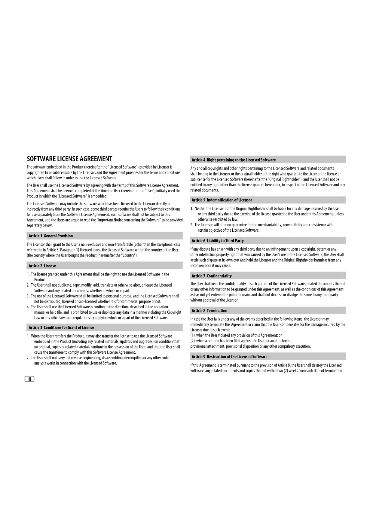 The software embedded in the Product (hereinafter the "Licensed Software") provided by Licensor is copyrighted to or sublicensable by the Licensor, and this Agreement provides for the terms and conditions which Users shall follow in order to use the Licensed Software. The User shall use the Licensed Software by agreeing with the terms of this Software License Agreement. This Agreement shall be deemed completed at the time the User (hereinafter the "User") initially used the Product in which the "Licensed Software" is embedded. The Licensed Software may include the software which has been licensed to the Licensor directly or indirectly from any third party. In such case, some third parties require the Users to follow their conditions for use separately from this Software License Agreement. Such software shall not be subject to this Agreement, and the Users are urged to read the "Important Notice concerning the Software" to be provided separately below. Article 1 General Provision The Licensor shall grant to the User a non-exclusive and non-transferable (other than the exceptional case referred to in Article 3, Paragraph 1) licensed to use the Licensed Software within the country of the User. (the country where the User bought the Product (hereinafter the "Country") Article 2 License