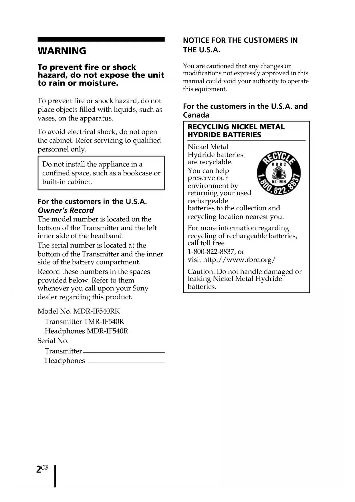 WARNING To prevent fire or shock hazard, do not expose the unit to rain or moisture. To prevent fire or shock hazard, do not place objects filled with liquids, such as vases, on the apparatus. To avoid electrical shock, do not open the cabinet. Refer servicing to qualified personnel only. Do not install the appliance in a confined space, such as a bookcase or built-in cabinet. For the customers in the U.S.A. Owner’s Record The model number is located on the bottom of the Transmitter and the left inner side of the headband. The serial number is located at the bottom of the Transmitter and the inner side of the battery compartment. Record these numbers in the spaces provided below. Refer to them whenever you call upon your Sony dealer regarding this product. Model No. MDR-IF540RK Transmitter TMR-IF540R Headphones MDR-IF540R Serial No. Transmitter Headphones