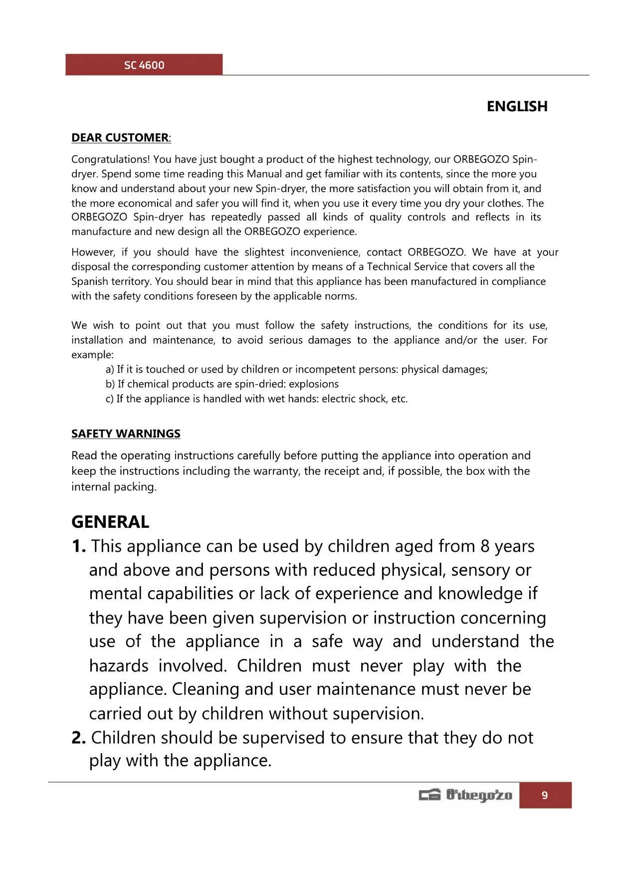 ENGLISH DEAR CUSTOMER: Congratulations! You have just bought a product of the highest technology, our ORBEGOZO Spin- dryer. Spend some time reading this Manual and get familiar with its contents, since the more you know and understand about your new Spin-dryer, the more satisfaction you will obtain from it, and the more economical and safer you will find it, when you use it every time you dry your clothes. The ORBEGOZO Spin-dryer has repeatedly passed all kinds of quality controls and reflects in its manufacture and new design all the ORBEGOZO experience. However, if you should have the slightest inconvenience, contact ORBEGOZO. We have at your disposal the corresponding customer attention by means of a Technical Service that covers all the Spanish territory. You should bear in mind that this appliance has been manufactured in compliance with the safety conditions foreseen by the applicable norms. We wish to point out that you must follow the safety instructions, the conditions for its use, installation and maintenance, to avoid serious damages to the appliance and/or the user. For example: a) If it is touched or used by children or incompetent persons: physical damages; b) If chemical products are spin-dried: explosions c) If the appliance is handled with wet hands: electric shock, etc. SAFETY WARNINGS Read the operating instructions carefully before putting the appliance into operation and keep the instructions including the warranty, the receipt and, if possible, the box with the internal packing. GENERAL