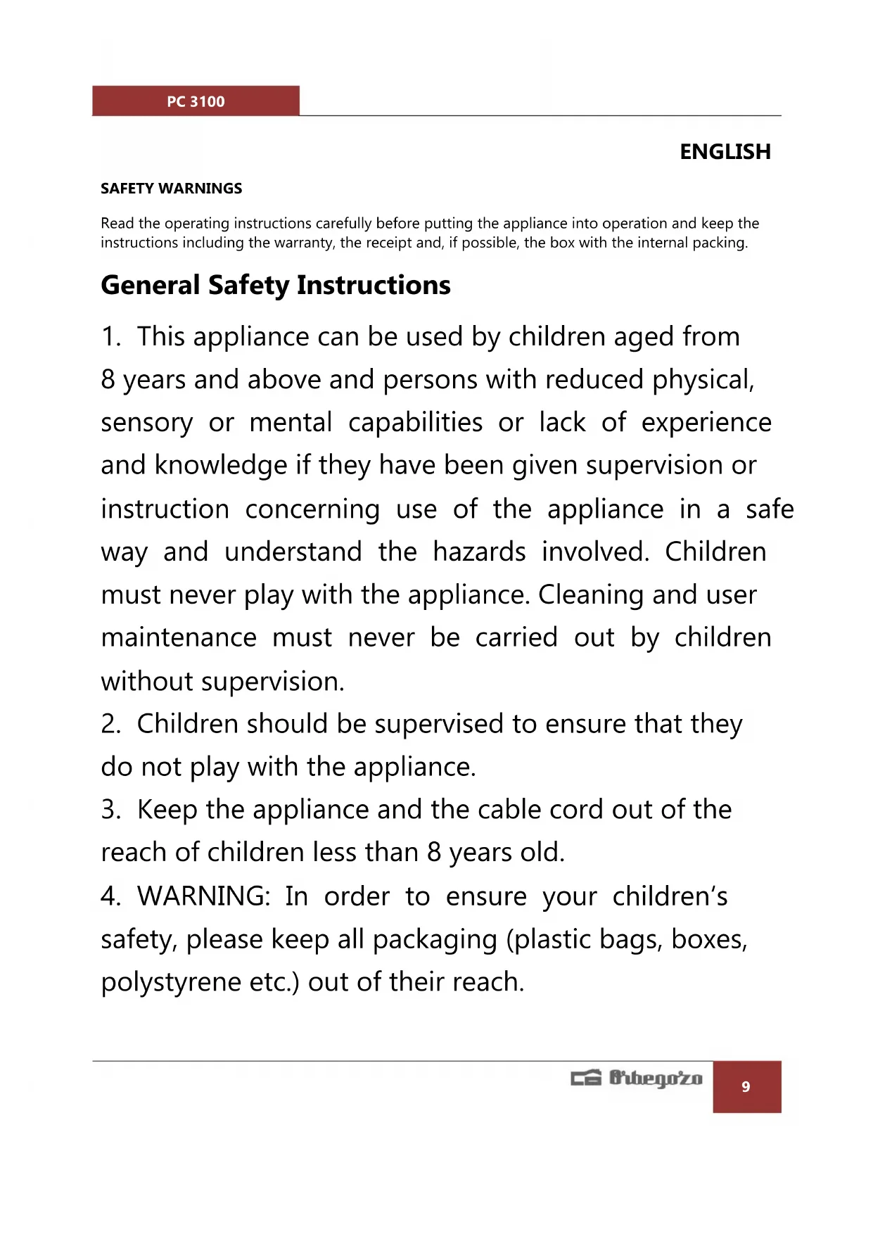 safety, please keep all packaging (plastic bags, boxes, polystyrene etc.) out of their reach.PC 3100