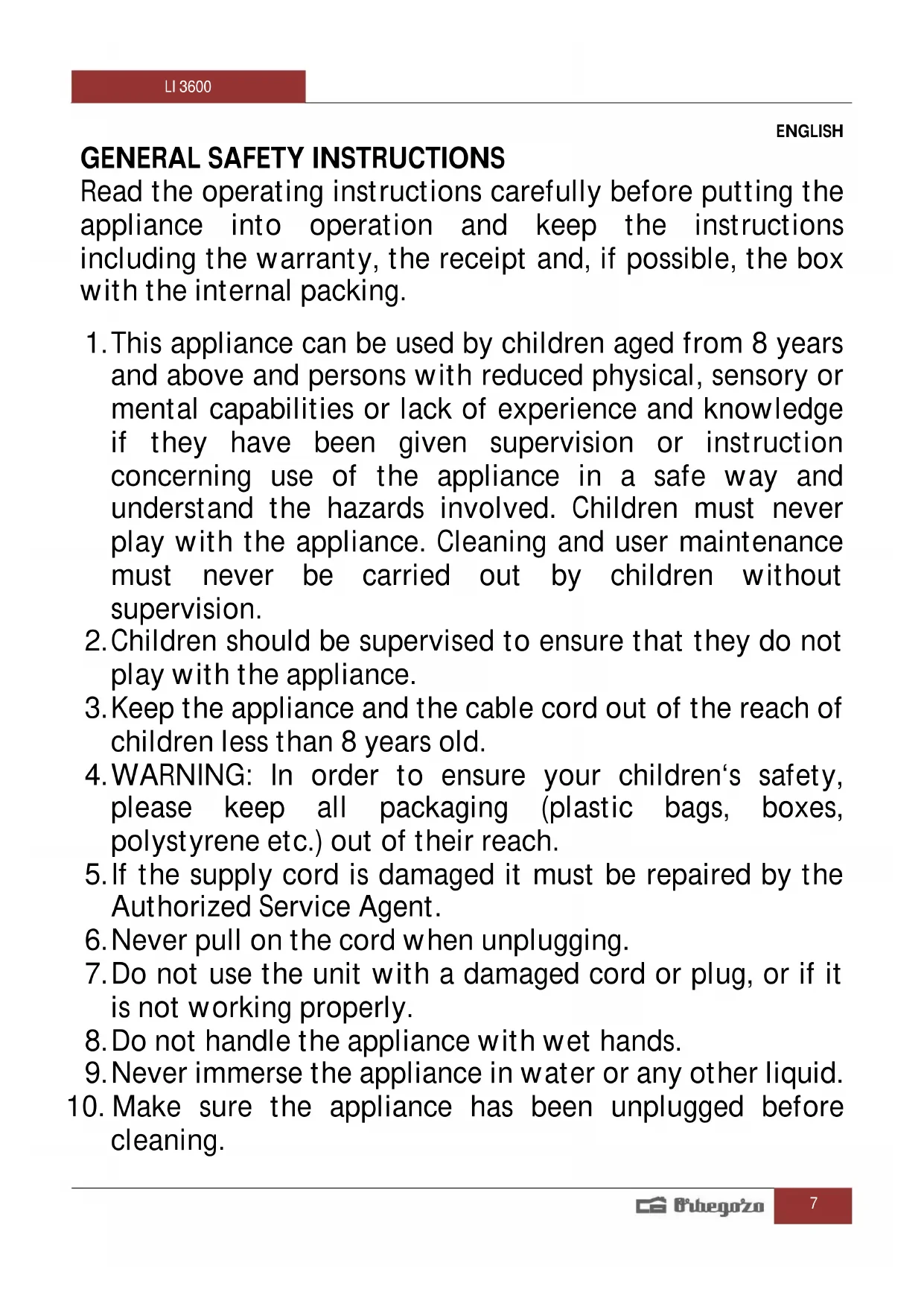 - Remove the plug from the wall socket and allow the apparatus to cool down before cleaning.LI 3600