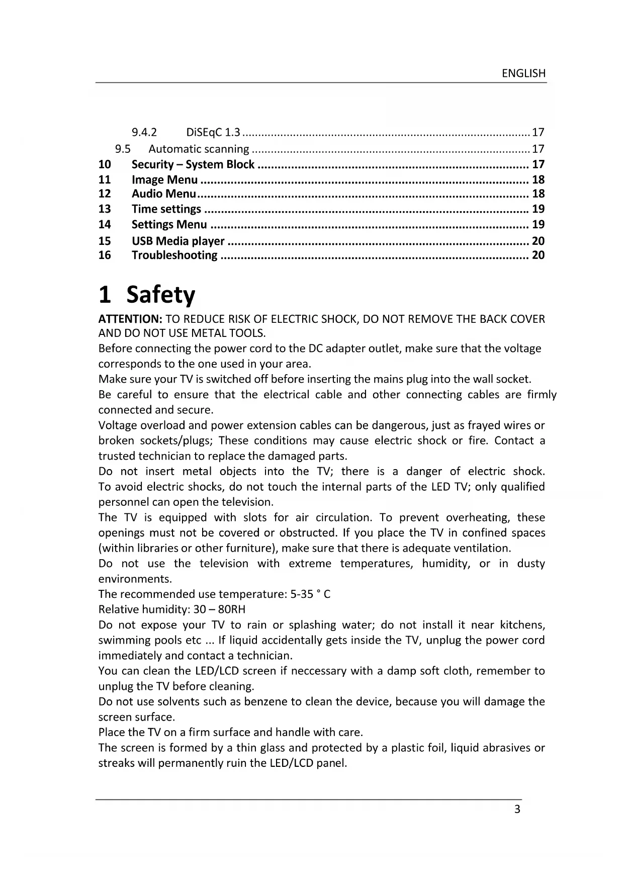 - ! 16! Troubleshooting ! 1 Safety ATTENTION: TO REDUCE RISK OF ELECTRIC SHOCK, DO NOT REMOVE THE BACK COVER AND DO NOT USE METAL TOOLS. Before connecting the power cord to the DC adapter outlet, make sure that the voltage corresponds to the one used in your area. Make sure your TV is switched off before inserting the mains plug into the wall socket. Be careful to ensure that the electrical cable and other connecting cables are firmly connected and secure. Voltage overload and power extension cables can be dangerous, just as frayed wires or broken sockets/plugs; These conditions may cause electric shock or fire. Contact a trusted technician to replace the damaged parts. Do not insert metal objects into the TV; there is a danger of electric shock. To avoid electric shocks, do not touch the internal parts of the LED TV; only qualified personnel can open the television. The TV is equipped with slots for air circulation. To prevent overheating, these openings must not be covered or obstructed. If you place the TV in confined spaces (within libraries or other furniture), make sure that there is adequate ventilation. Do not use the television with extreme temperatures, humidity, or in dusty environments. The recommended use temperature: 5-35 ° C Relative humidity: 30 – 80RH Do not expose your TV to rain or splashing water; do not install it near kitchens, swimming pools etc If liquid accidentally gets inside the TV, unplug the power cord immediately and contact a technician. You can clean the LED/LCD screen if neccessary with a damp soft cloth, remember to unplug the TV before cleaning. Do not use solvents such as benzene to clean the device, because you will damage the screen surface. Place the TV on a firm surface and handle with care. The screen is formed by a thin glass and protected by a plastic foil, liquid abrasives or streaks will permanently ruin the LED/LCD panel.TELE Sytem p. 20