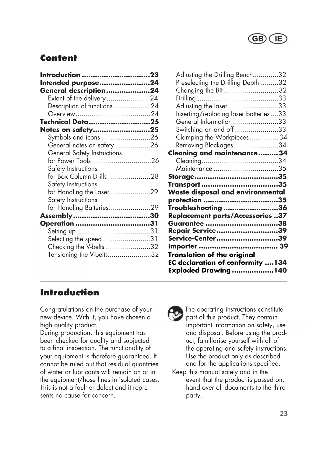 - Tensioning the V-belts GB IE Intended purpose The bench drill is designed for drilling in metal, wood, plastic and tiles. Straight shank drills with a drilling diameter from 1.5 mm to 16 mm can be used.The device is intended to be used by do-it-yourselfers. It was not designed for heavy commercial use. The tool is not to be used by persons. under the age of 16. Children over the age of 16 may use the tool except under supervision. The manufacturer is not liable for damage caused by an improper use or incorrect operation of this device. General description The illustration of the principal functioning parts can be found on the front and back foldout pages. Extent of the delivery Carefully unpack the appliance and check that it is complete. Dispose of the pa-ckaging material correctly.- Baseplate- Drilling bench - Column tube- Motor unit- 3 drill lifting arms- Safety device- Drill chuck- Drill chuck key- Allen key- Vice- 2 x 1.5 V batteries, AAA size- Mounting material- Instruction Manual Description of functions Please refer to the descriptions below for information about the operating devices. Overview p. 3224