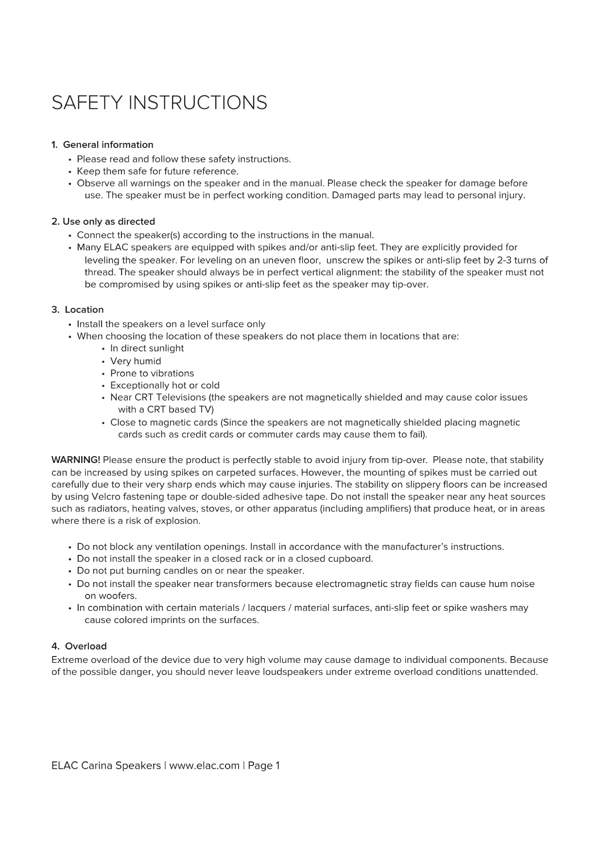Extreme overload of the device due to very high volume may cause damage to individual components. Because of the possible danger, you should never leave loudspeakers under extreme overload conditions unattended.ELAC Carina Speakers | www.elac.com | Page 2